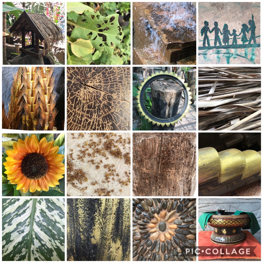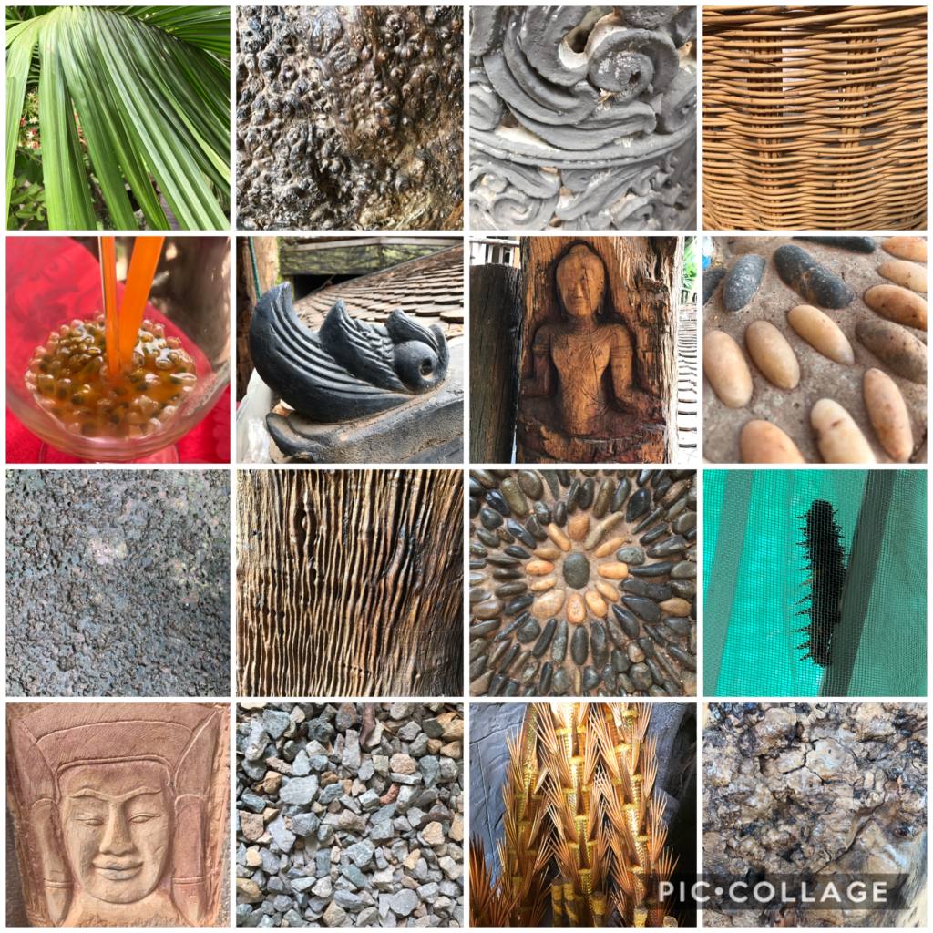 Greetings from Cambodia! It’s Day Ome of our Art Mojo Workshop with Tracy Verdugo today. We started the day by walking around the hotel and photographing with our phones of whatever interested us with the focus on texture, colours and patterns. Three sets of collages each representing those categories were then created using a Pic Collage app. By doing this we gain some inspiration for symbols which we could incorporate in our artwork.