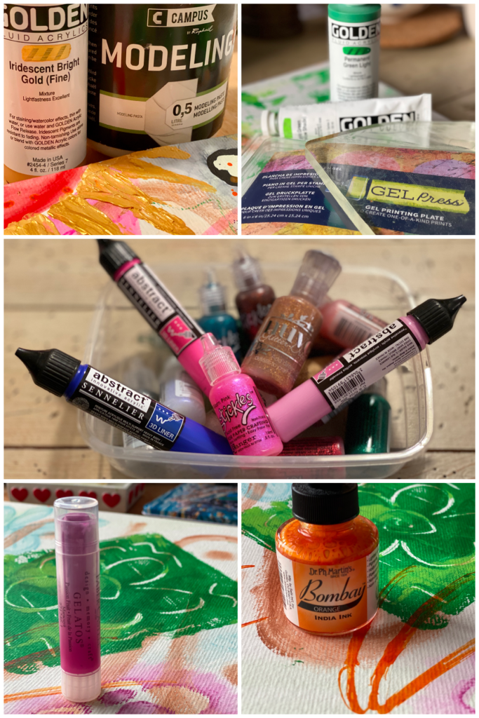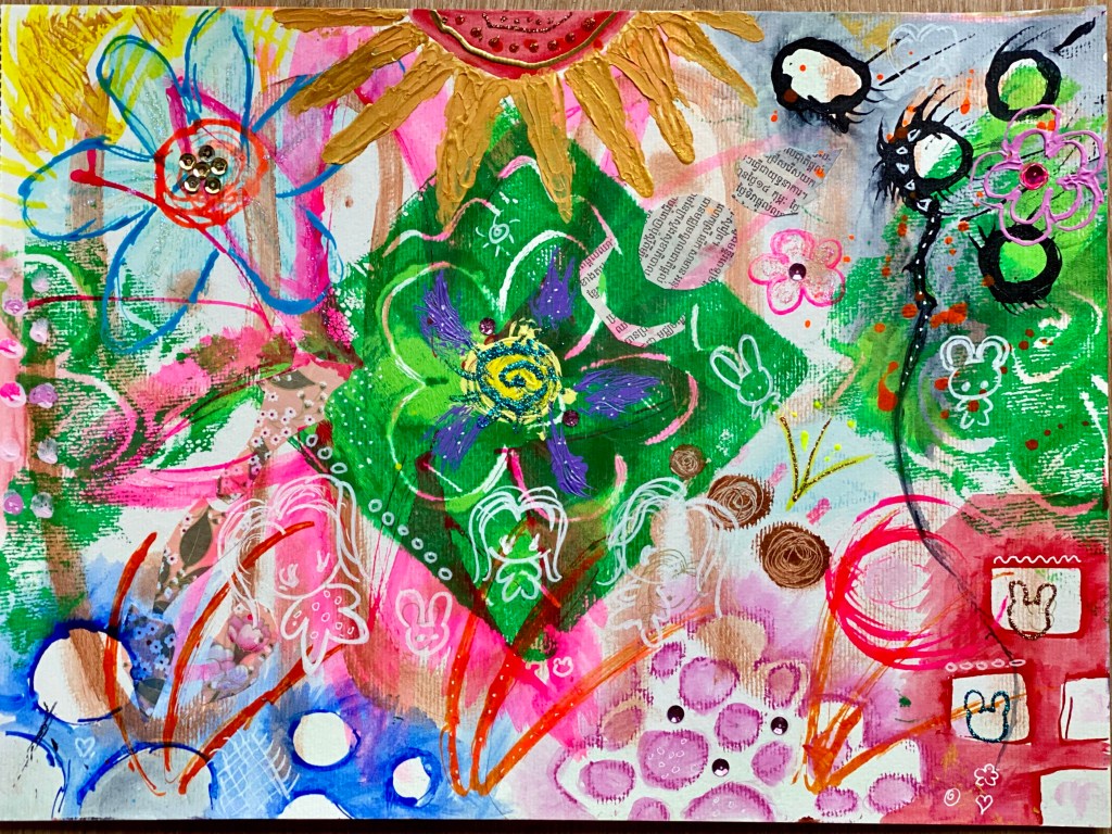 When I got back from the Paint Mojo workshop a few weeks ago, I couldn’t wait to start a new painting at home! I was so excited to continue with what I had picked up there with all the bright vivid colours, the randomly free style and transferring onto paper whatever came to mind. Being able to come home also means I have all my art supplies at hand so can really go full mixed media!