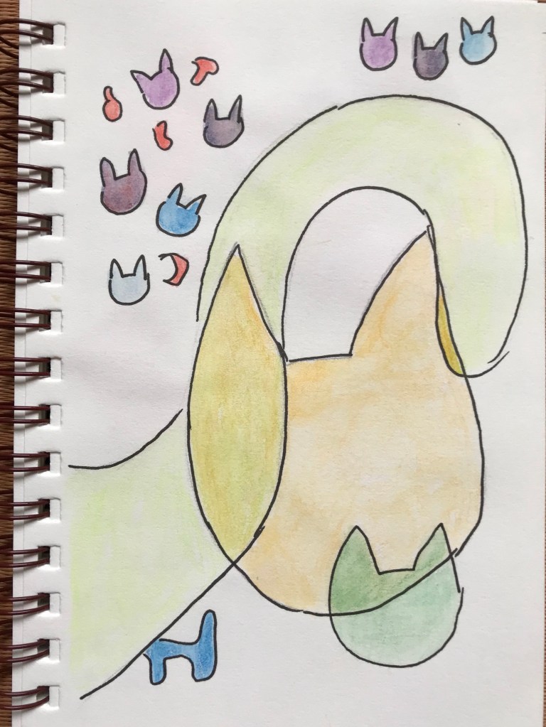And how interesting that on the flight to Tokyo, I already began sketching cats! All on a small sketchbook (Strathmore Visual Journal) . First to get some ideas, I used graphite pencil but eventually switched to black permanent ink (Faber Castell’s). The drawing is quite abstract, with kittens large and small and partial like just the head or the tail. Once that was done, I began colouring using aquarelle pencils (Caran d’Ache Prismalo) and spread the colours with a wet brush pen. Those are the only colouring mediums I brought, a set of 12 shades.