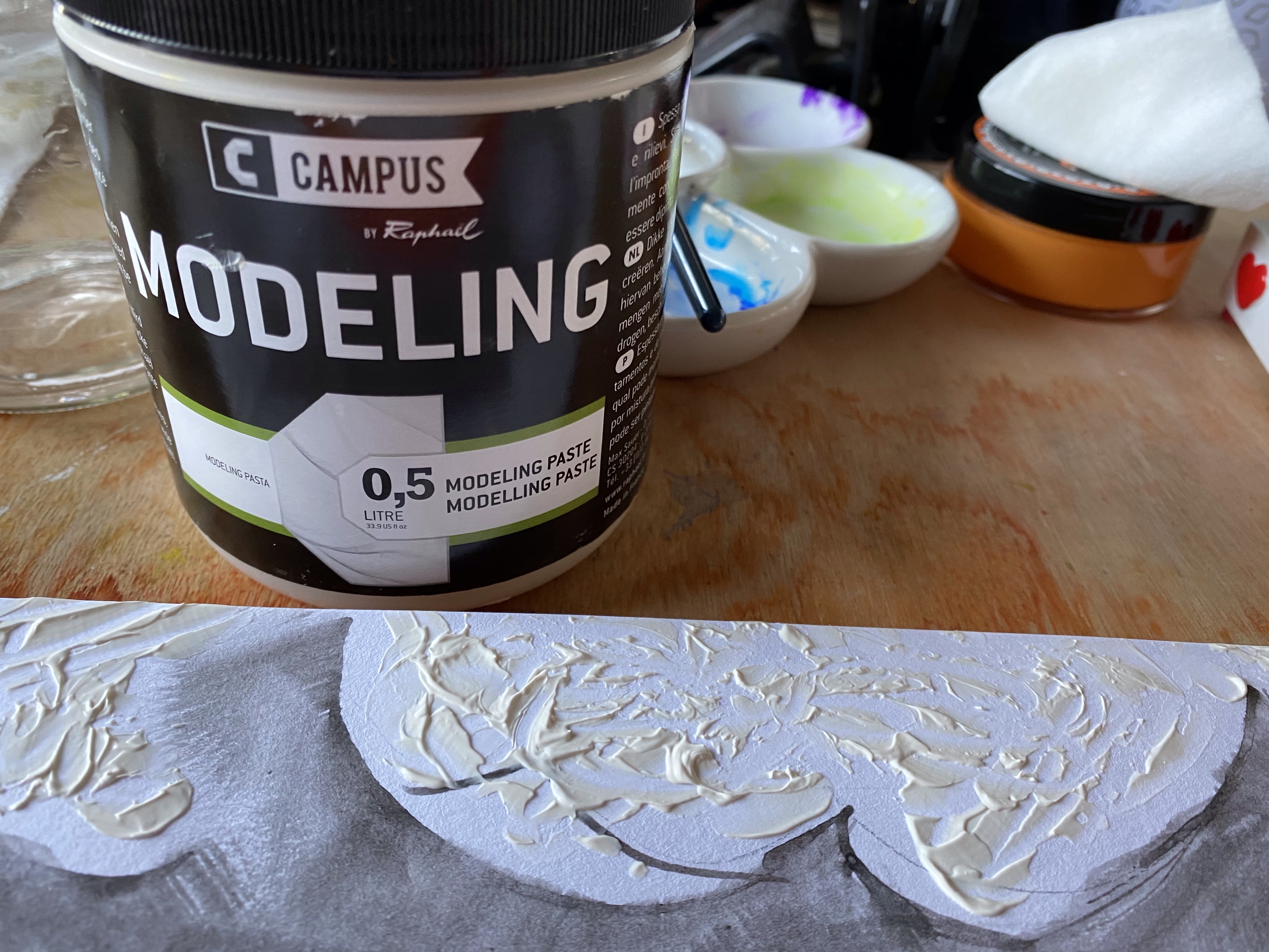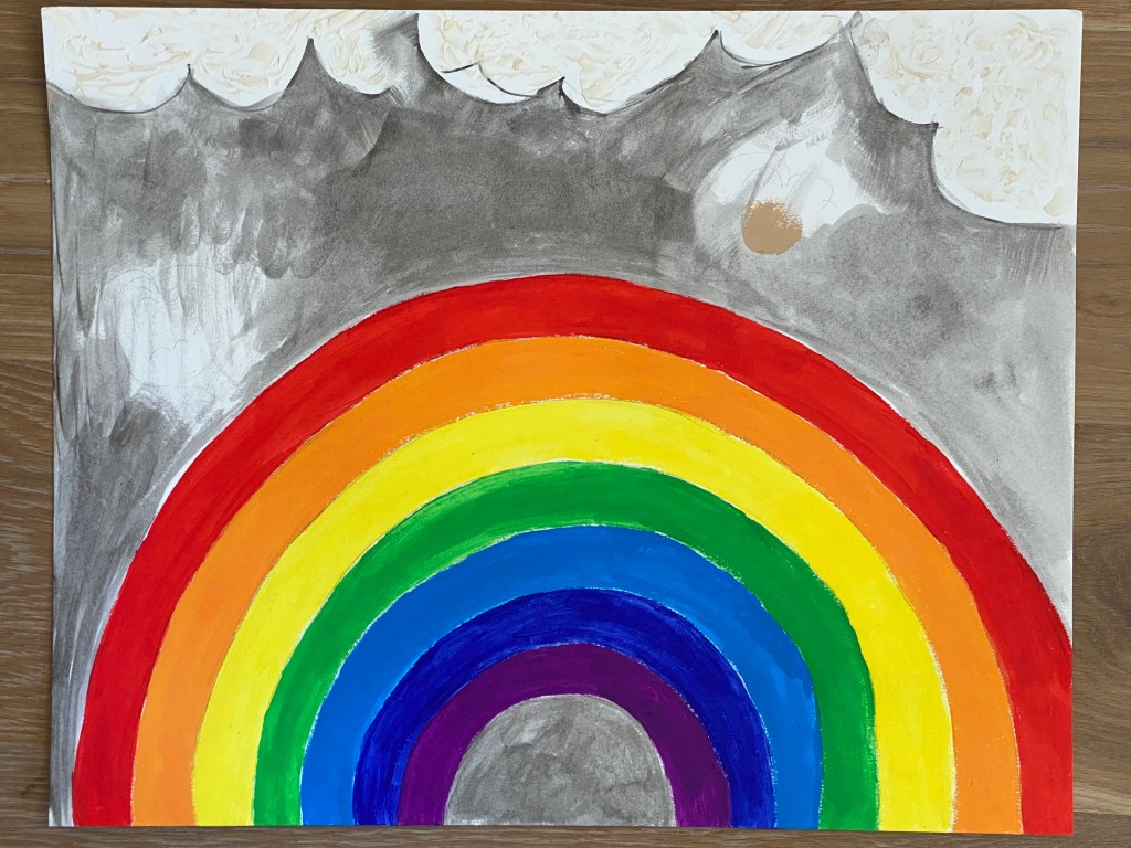 I firstly painted the background, the grey sky with some clouds. Drops of grey acrylic ink were applied directly on the area and swirled around with a wet brush dipped in water. Once dry, I spread some modelling paste on where the clouds would be, and whilst waiting for that to harden, I began colouring my rainbow. I made sure I got the colour order correct this time! This second painting is to represent the proper rainbow.