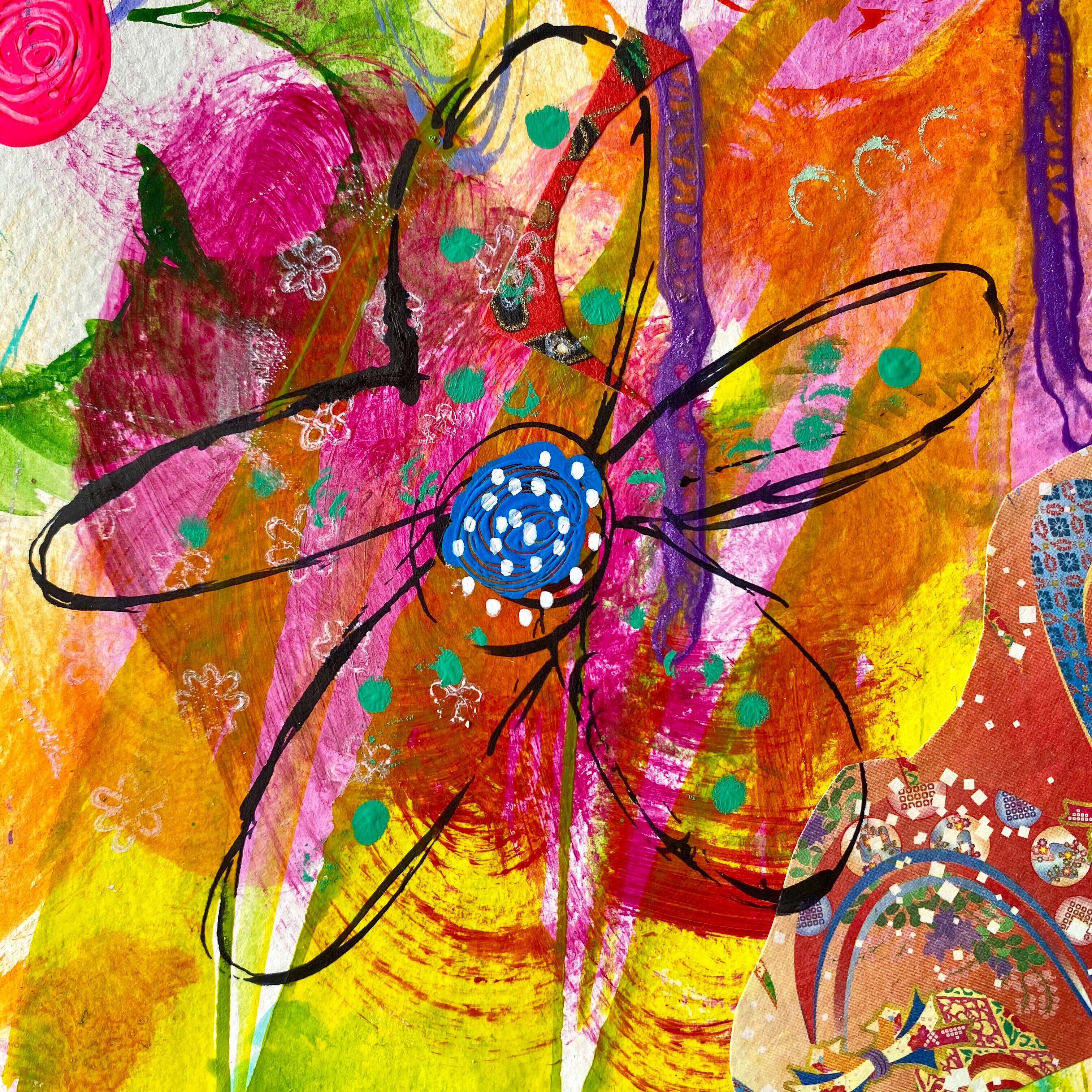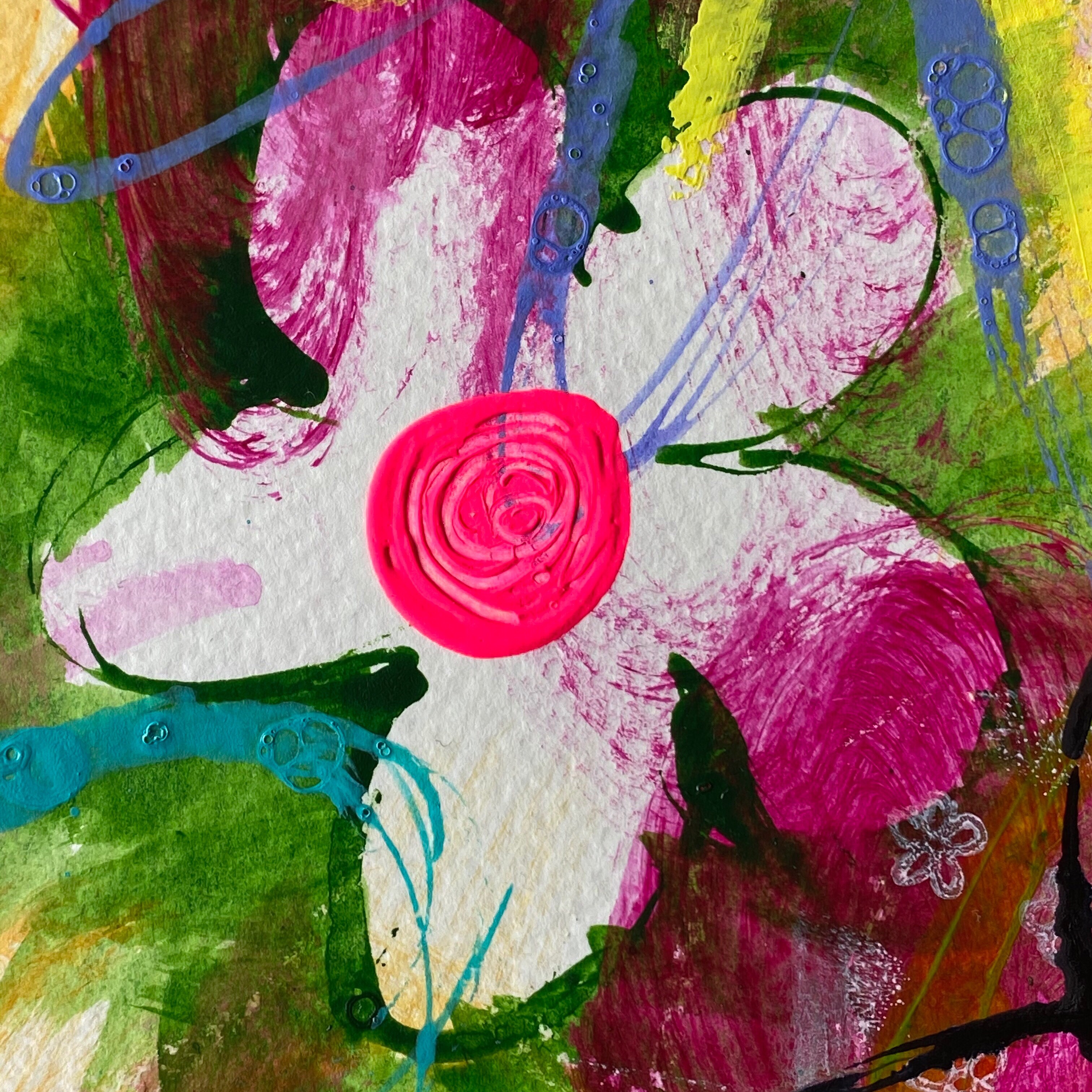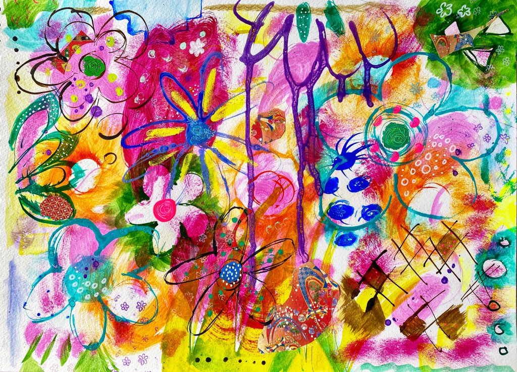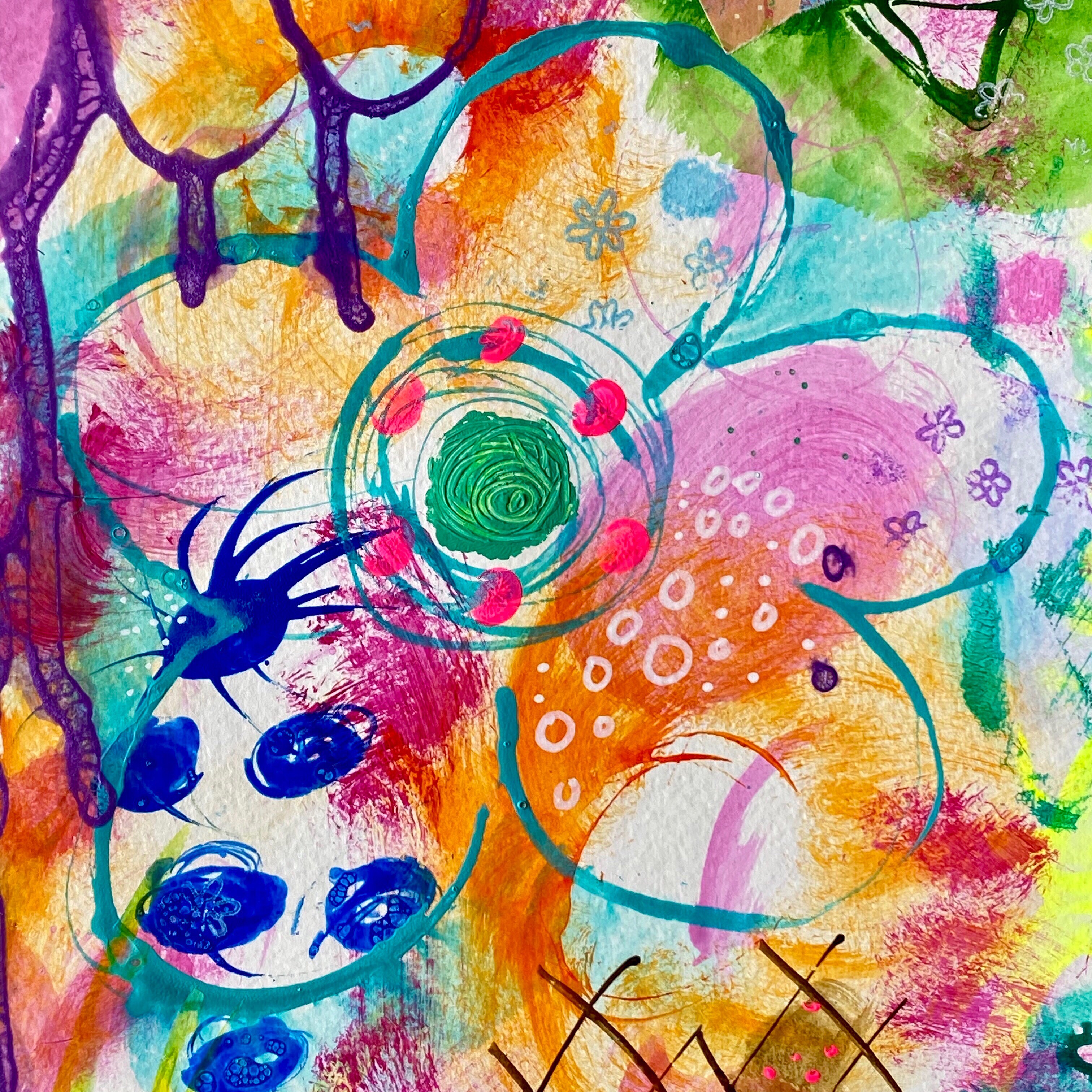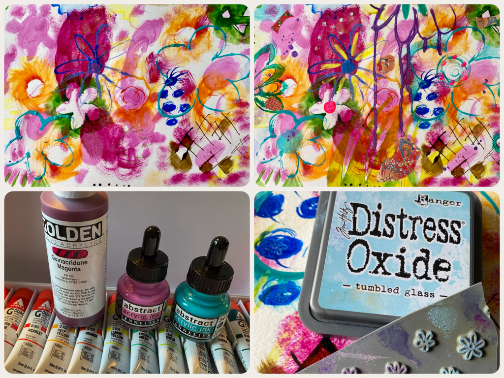 As you gathered, I was happily working my way through this painting, excitedly layering inks one on top of the other and enthusiastically doodling flowers as well as other shapes. Other mediums I went for included gouache (Holbein’s Acryla), gluing scraps of origami paper and stamping small flowers with Distress Oxide.