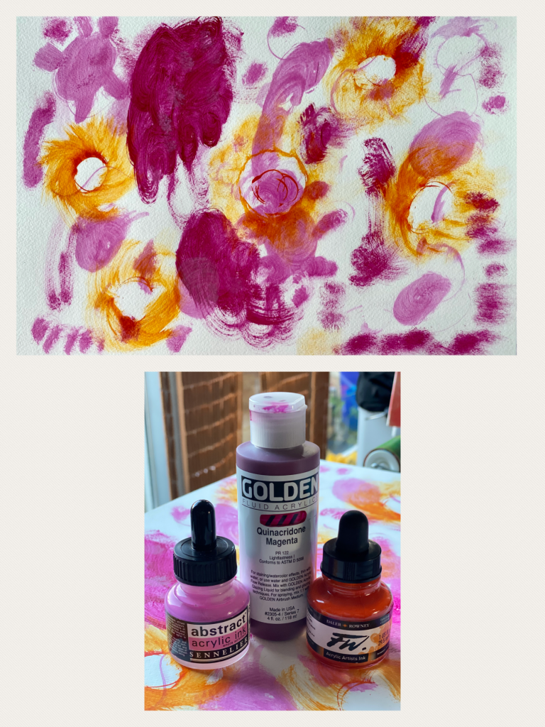 I started with the Magenta fluid acrylic which had been used in the Rainbow Project. Longing to avoid colours from the rainbow, I stuck to pinks and then added some orange acrylic ink, a combination I never have done before. First thing that came to mind was that I’d definitely do a floral theme!