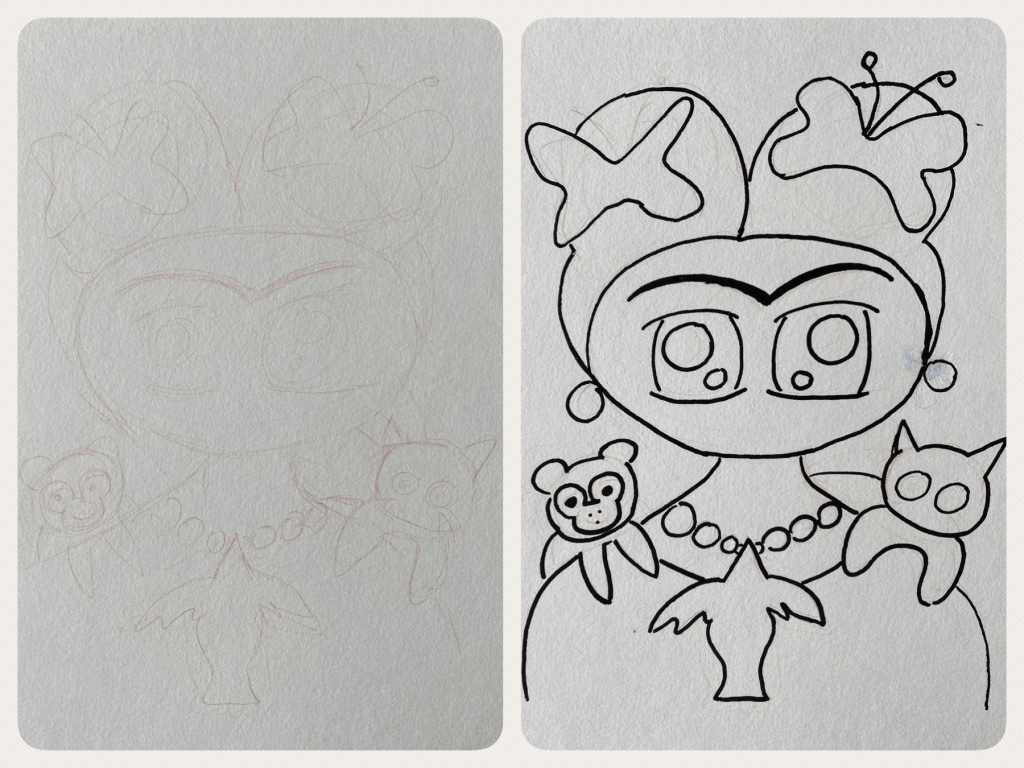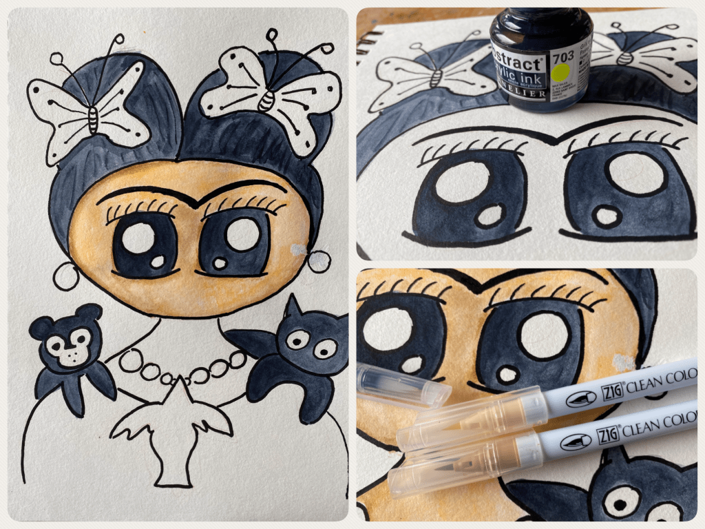 Here is another painting I created whilst following Ady Almanza’s FB tutorial! A new doll is introduced in the form of a Mexican painter called Frida Kahlo known for her self-portraits. One of her famous works is apparently the “Self Portrait with Thorn Necklace and Hummingbird” from 1940 in which she has a monkey and a cat rested on each side of her shoulder. As Ady is from Mexico too, I think it’s so sweet that she’s introduced a fellow compatriot as inspiration.