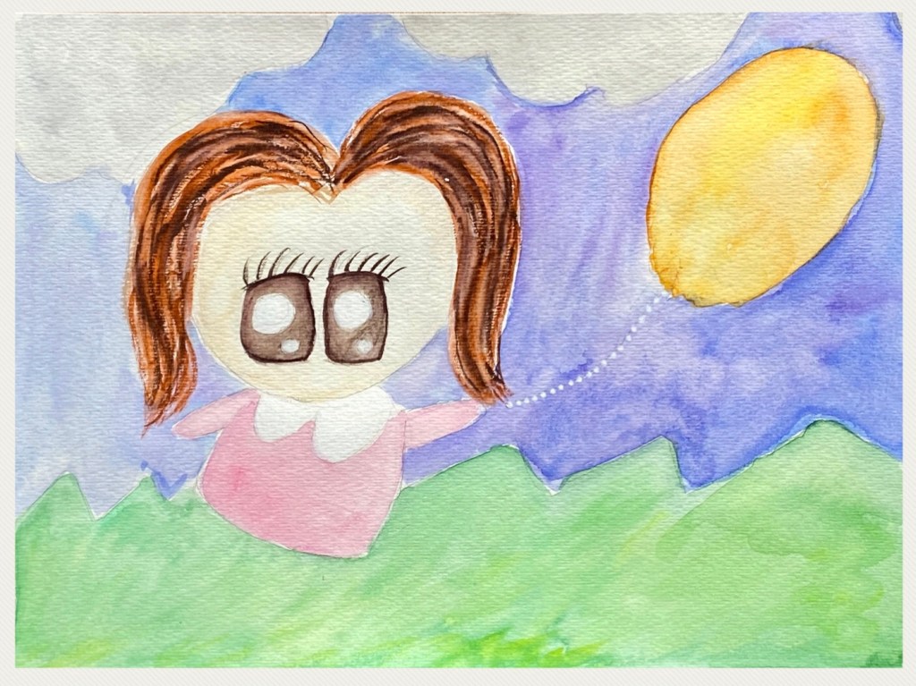 I went back to the wet on wet method for the clouds, balloon and dress. The eyes though were firstly lined with the Kuretake watercolor brush pen in brown then spread and diluted with water. To finish off, white Uni Posca markers were then used for the whites of the eyes and collar as well as the balloon string. And here we are, a cute and simple painting of Little One making the most of the quarantine days!