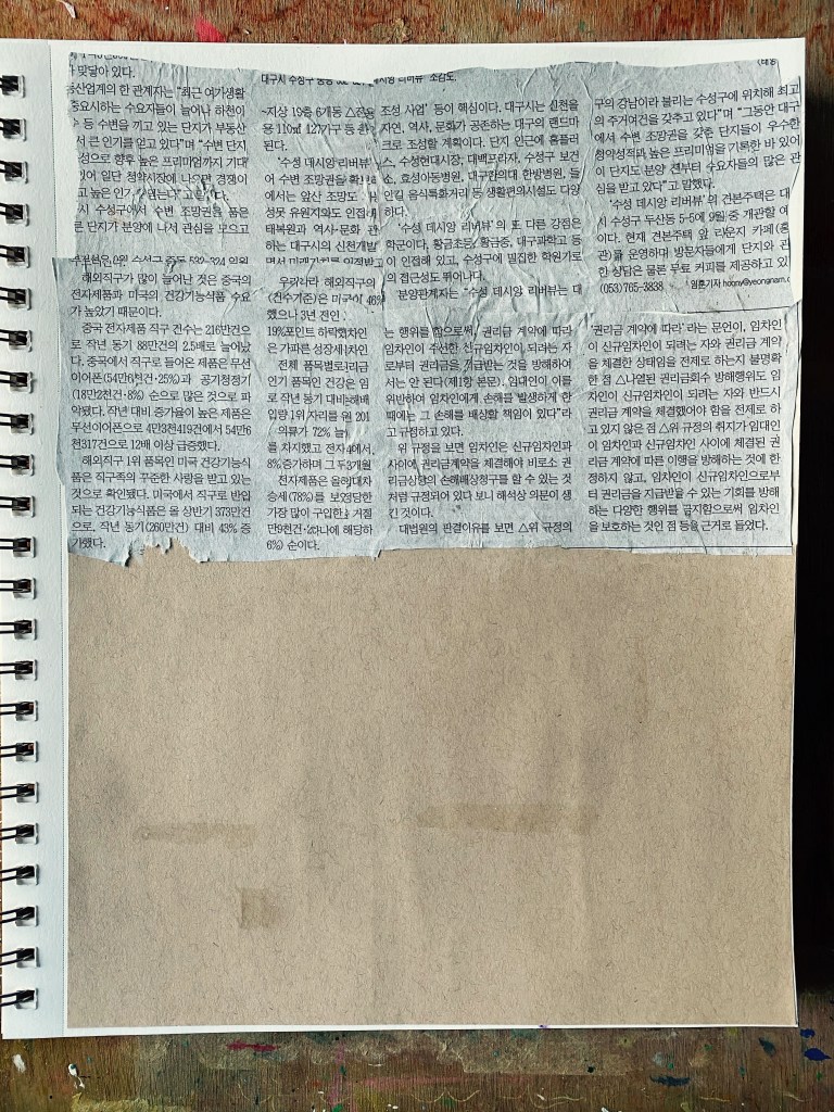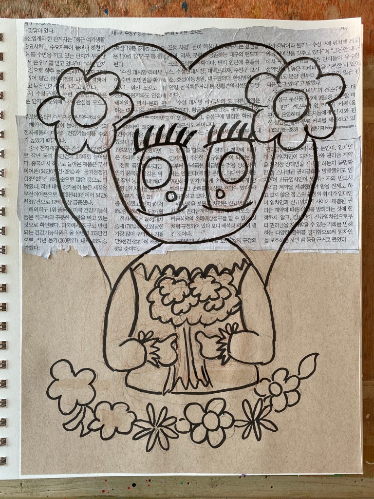 In her junk journal, Ady makes her cute drawings and for the Spring Girl, she had as background a Hebrew-language newspaper column on one half and brown package envelope on the other. I liked the idea so much that I improvised by making a collage out of some Korean-language newspaper one the top half of a page from my Strathmore Mixed Media sketchbook. For the bottom half, I pulled out some paper from my Toned Tan sketchbook and glued it on,
