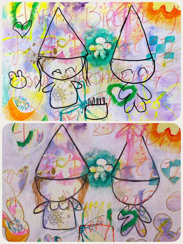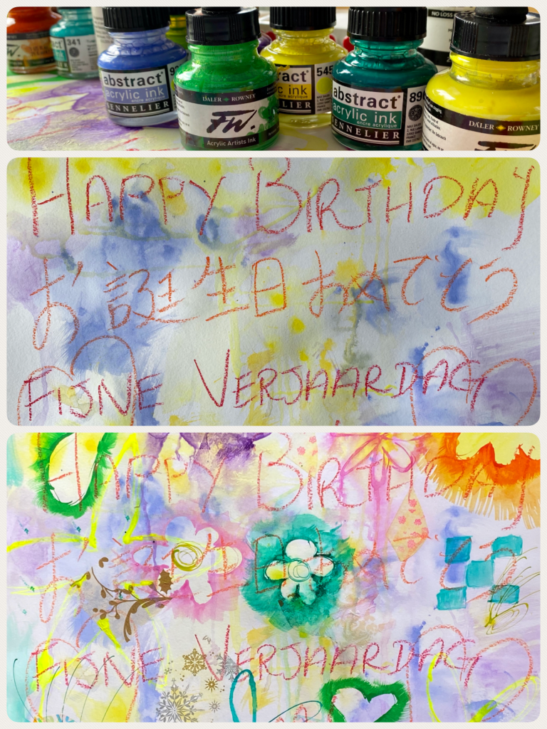 I began by scribbling “Happy Birthday” in English, Japanese and Dutch using my oil pastels. For those interested, it’s just a set of cheap ones I got in Japan “Cray-Pas” by Sakura. Apologies for the bad photo and not so great handwriting but here it is: