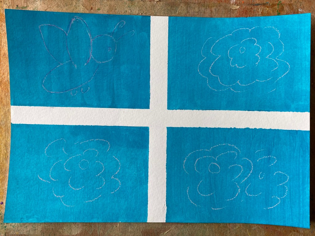 Ady used four small square canvas frames for this project. Unfortunately I don’t have any and had to improvise. That’s part of the fun of being creative – making the most of what you have! I used the reverse side of a drawing on watercolor paper I didn’t like instead of throwing it away. First I applied masking tape to divide the paper into four then painted it all in blue (Dylusions Paint in Calypso Teal). I let it dry overnight before peeling the tape off carefully.