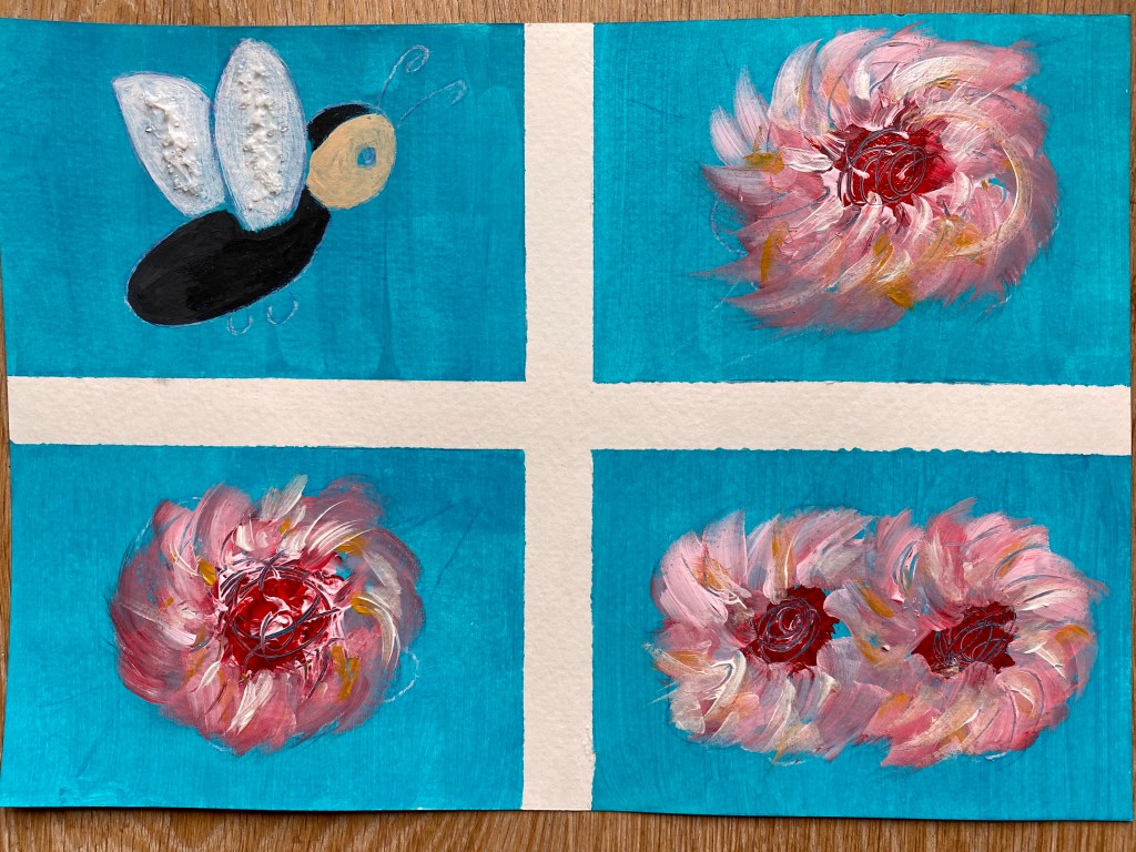 - Whilst Ady was able to create separate paintings with individual canvas frames, I was reluctant to cut them up. This however would make the painting look a bit dull with four separate”boxes” of paintings. In this case, why not join them together? I then added some stems and leaves.