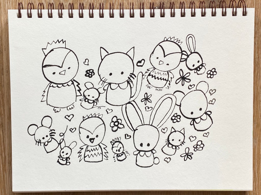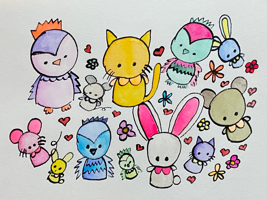 I love making my animals not only whimsical but also kawaii. Actually the main practice was with the owls but I added their friends too for fun, along with flowers and hearts. I must say that just sitting down and, for a change, doodling away to practice drawing was quite relaxing. It’s a good idea to do this from time to time! I’ll definitely be doing one soon, especially in between working on my paintings…