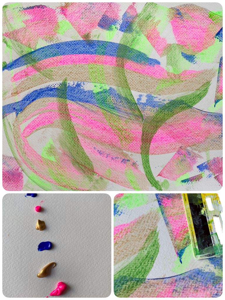 My idea to paint the tulips was actually by chance. Maybe I was speaking my mind? Once again, I was following another of Ana’s video tutorials on FB, and the lesson for the day was making a painting using a credit card! An old one of course. First we dot three or four of our favourite colours on paper and slide them across and around with the edge of the card. I used some fluorescent pink, gold and blue. Then switched to green, fluorescent green and iridescent white. The paper I used was a page from my Marabu Mixed Media sketchbook, A3 size.