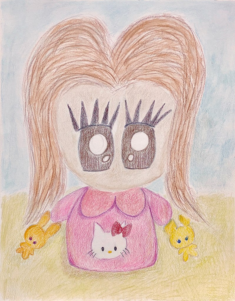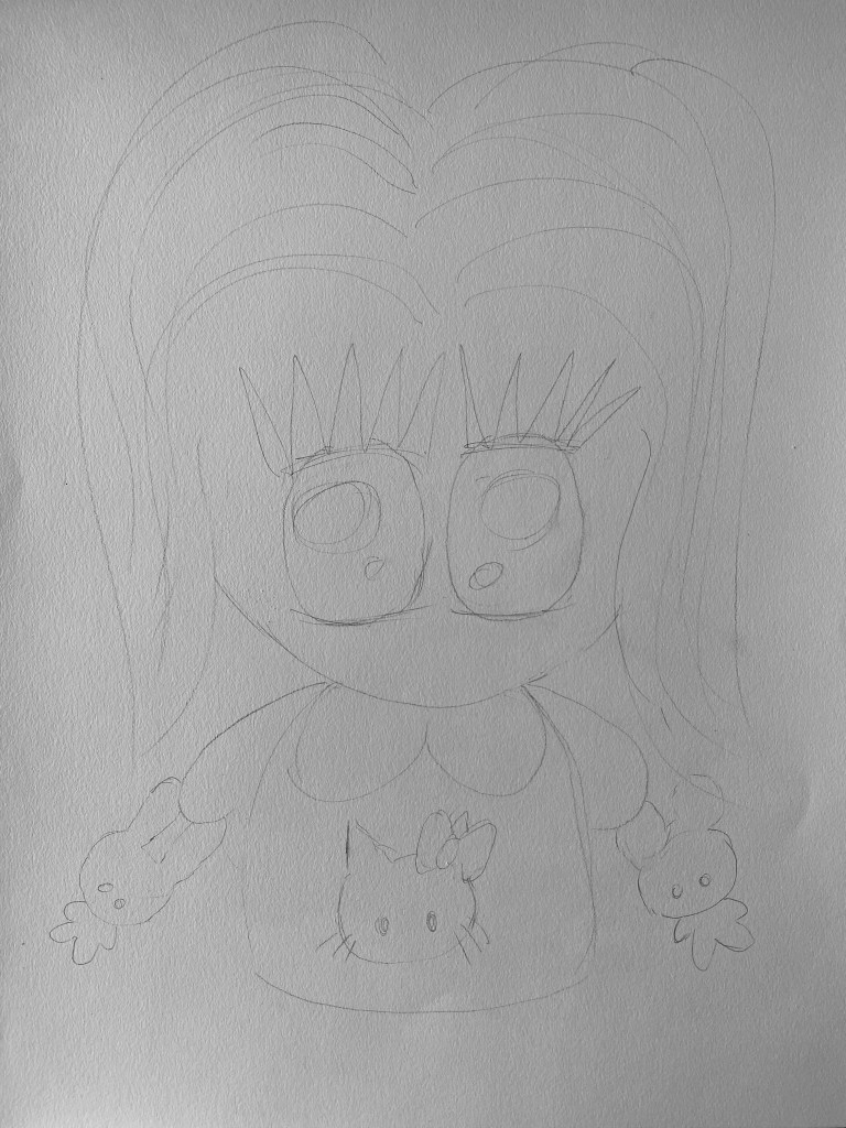 This time, I wanted to give painting a little break and go for coloured pencils for the first time in ages. Proper wax-based pencils were going to be used instead of aquarelle ones for a change. First I made a pencil sketch with graphite pencil on a page of my sketchbook, Strathmore Colored Pencil paper (27.9 x 35.6 cm, 163 gsm). Yes, it’s Little One clutching her kawaii teddy and bunny in her kawaii Hello Kitty dress!