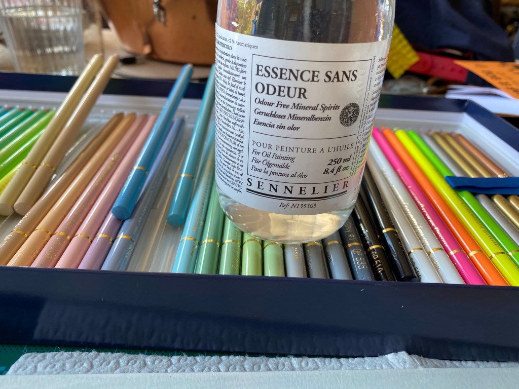 I dug out my Holbein’s Artist Colored Pencils for this. The set I have comes in a wide range of vibrant shades which is the reason I chose it. Whilst colours from aquarelle pencils are spread with water, one can use solvents for the ordinary wax pencils. I used that for the background mainly; for the sky and grass for instance I would use two shades of blue and green, respectively, and blend them together with some non-odor terpentine. Ditto for the hair but in several shades of brown although I went over them once the turpentine was dry. While turpentine works well, you have to wait till it’s completely dry before working on the area again or even next to it. That could take a while, at least half hour depending on how much used, but it’s worth the wait!