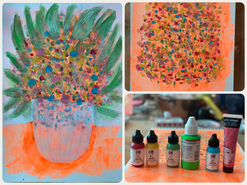 The other day, I was following another of Ana’s tutorials on Facebook. It was an abstract floral painting using acrylic paint, intending to be a bunch of pretty flowers in a vase. As usual though things didn’t go as expected so I recreated what I had and made something funny and cute out of it!