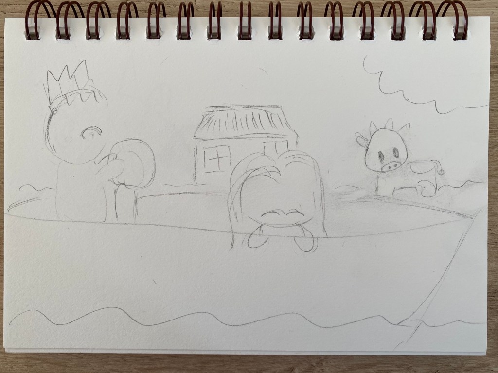 I had this cute idea of boyfriend driving the boat and me just sitting there leaning out with my hands out. We are of course both happy! Although he stuck a Dutch flag on the back of the boat, I replaced that in the drawing with an orange crown on his head, the National colour of the Netherlands or more precisely, Dutch royal family! On the side of the boat is a house and a cow. I saw quite a lot of cows today during the ride and most definitely wanted to include one. Now that was a challenge but I would definitely like to practice more and create my own whimsical cows one day! Although I sometimes prefer using aquarelle coloured pencils, I sketched with graphite pencil this time.