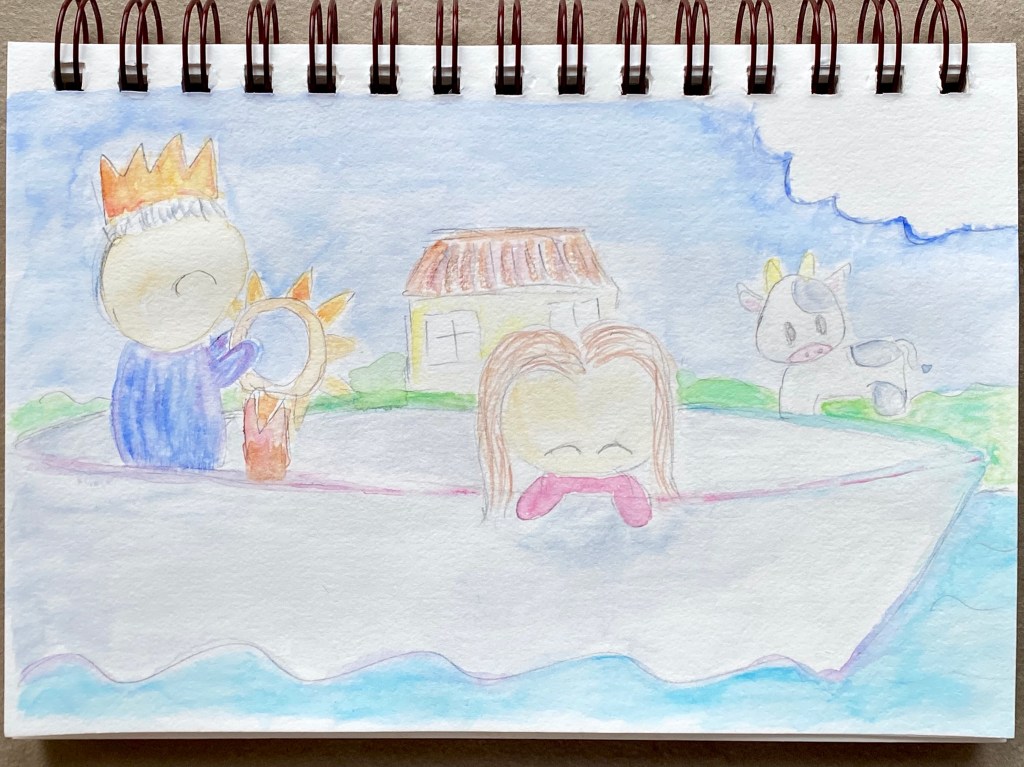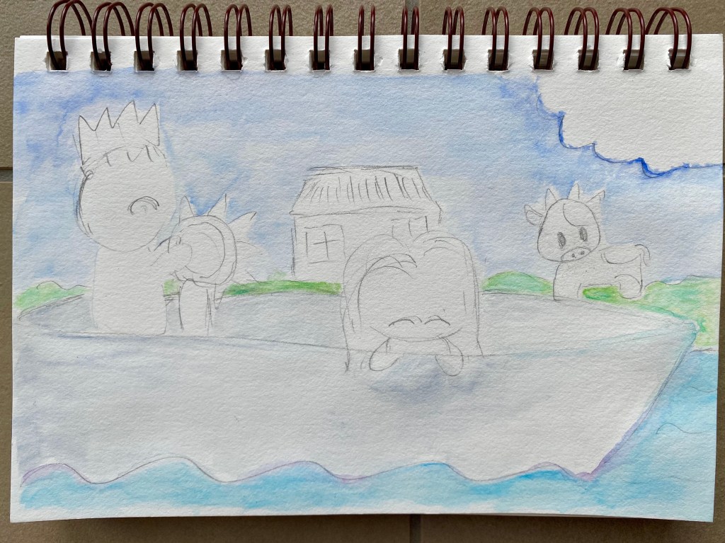 The rest was pretty straight forward. When you have a choice of just 16 colours you realise you can work around it and don’t need so many shades. I started with the faces first in yellow ochre then worked on my boyfriend first, then the house, followed by myself and the cow. Then I returned and went through the entire painting randomly to add some colours over them to give more dimension. The boat in particular I thought needed work on; it’s a metallic one so I went for a Payne’s Grey type shade firstly and added surrounded colours as reflection. At this point I wasn’t fussed about perfection. It was just a quick and easy painting on a small sketchbook expressing my mind and send my kawaii thoughts across! So I’m happy with it