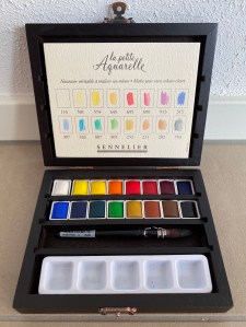Today my plan was to paint with watercolours. I try and travel light even for car rides. Not only do I carry my iPad with me but I also bring a few items to sketch with and if I have the time, to paint with. I brought with me the usual pencil, eraser, small sketchbook, permanent black inks in different sizes, gel pens in white, aquarelle pencils and water brush pens. This time, I included also my kawaii mini set of Sennelier water colour pans and what wonderful quality they are! Very well pigmented, similar to my set of Winsor & Newton pans.