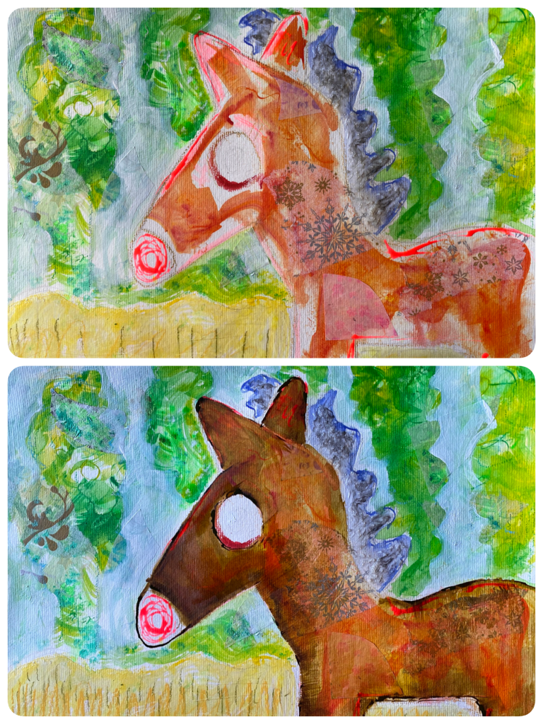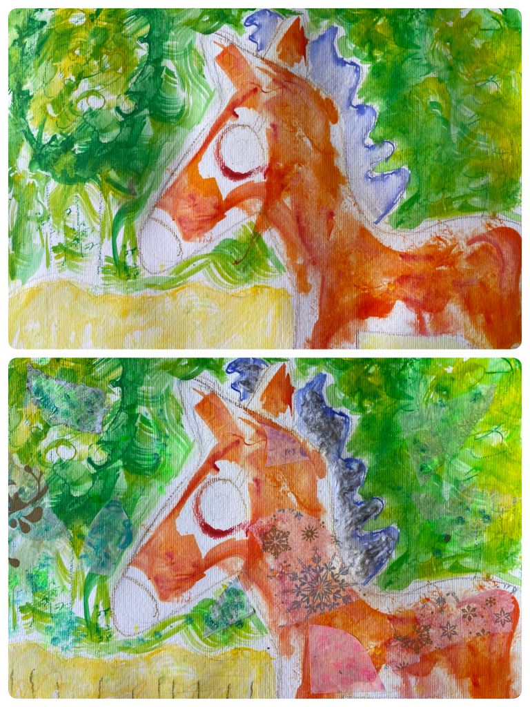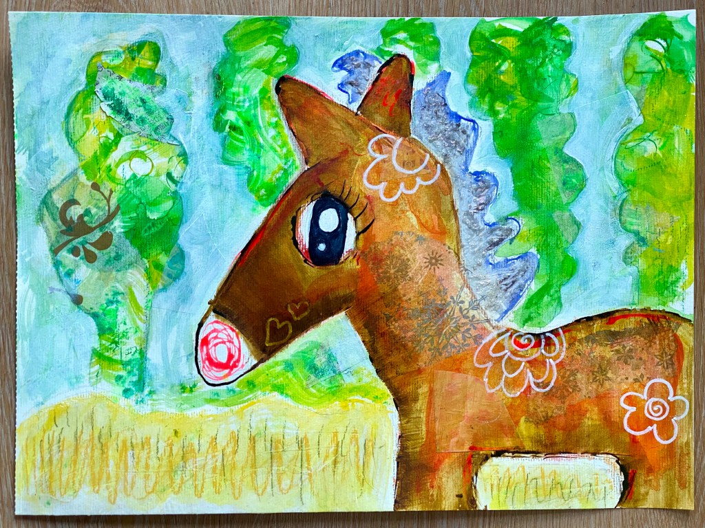 Once the inks were dry, I glued in a few collages of paper napkins and deli paper. Textures were also added as I wanted to try my new products for the first time. On the pony’s mane I spread some “Structuring Gel with Crystal Fragments” (Lucas). Fine Pumice Gel Golden) was smoothed on the grass area but I discovered that rather being a texturizing medium, it was more a primer for other mediums like pencils or pastels so once that was dry, I drew in some stripes with soft pastels.