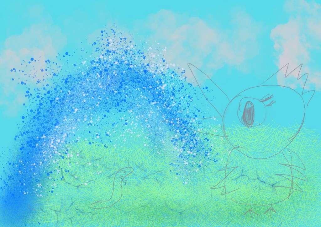 Then I incorporated the water as Layer Two. Firstly, the pre-set patterns of “water” was spread in blue across the grass area. Then the next was a challenge, trying to get the best effect as possible for emulating water spray. I went for spray paints and splatters in blue and white. The bird was then sketched in as the next Layer using an “HB pencil”. For fun, I even added a little worm!