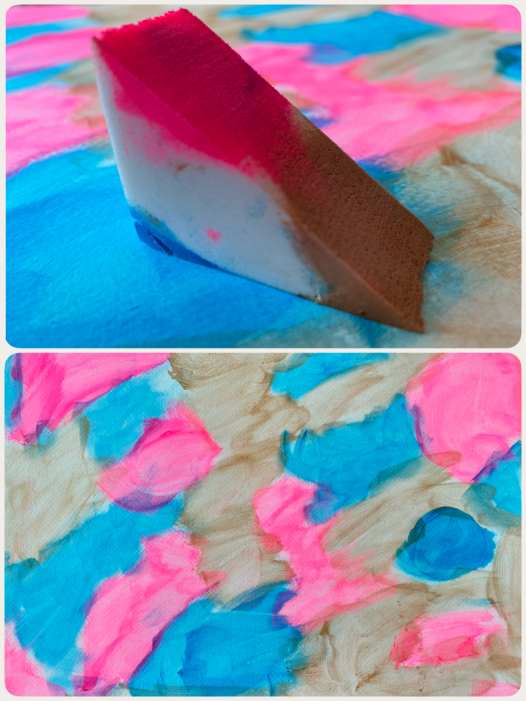 Some artists use a sponge stick to spread paint, but I wanted to experiment with an old make-up sponge using some of my favourite colours. Here, I used bright blue, gold and fluorescent pink on Marabu’s mixed media A3 pad (300 gsm). The triangular make-up sponge worked really well and when washed with soap and water can be used over and over again.