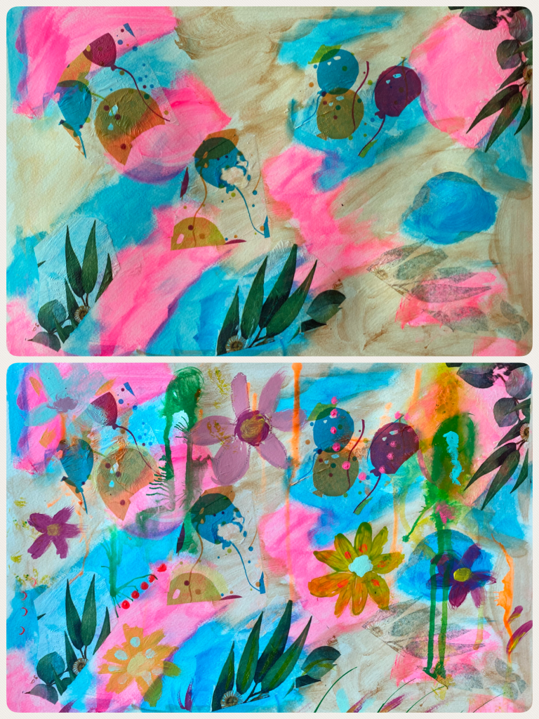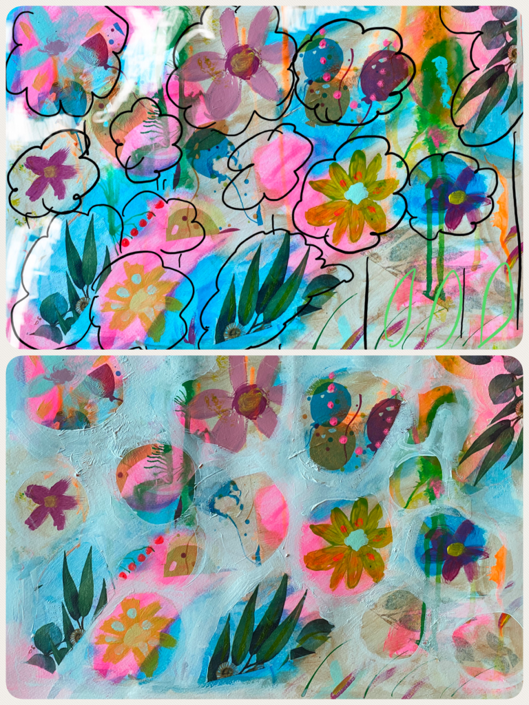 I was now ready to add some negative space! The intention was to create some colourful flowers with the existing piece. As I have been doing before, I firstly photographed the painting then on my iPad marked up the areas digitally. On the actual painting, I further carefully drew the markings with soft pastels before painting around it with titanium white acrylic paint. The white background was then left as it was instead of being painted over by another colour.