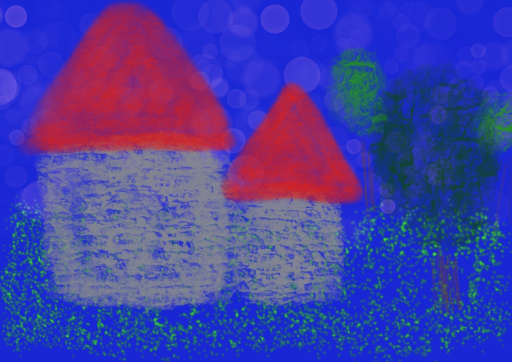 Here goes Layer 2. For the house and surroundings, I didn’t use paint or ink but experimented with texture by using the elements option. The red roof was Concrete Block and the base of the house a Stone Wall. I made the trees a mixture of different greens as Twisted Trees which gave interesting effects. It’s not intended to be two houses, but two parts in one.