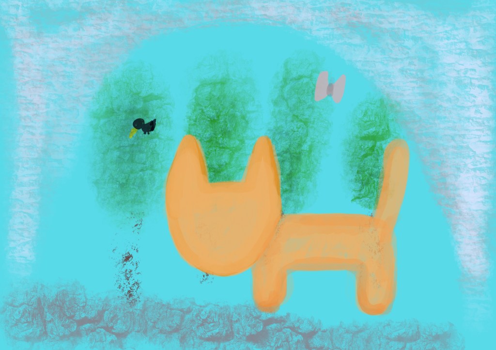 Layer 3. I then drew and painted Ginger using acrylic paint. Choosing the perfect gingery orange was quite a challenge. The bird and the butterfly were draw in with markers as the details are quite tiny.