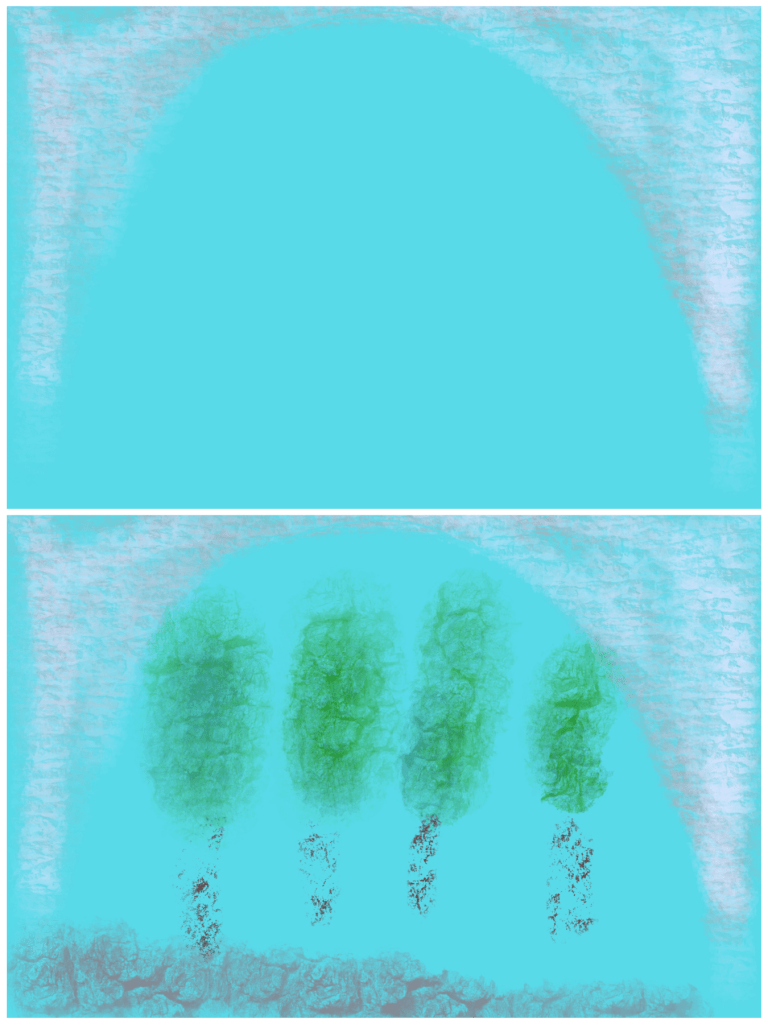 Layers 1 and 2. A bright turquoise blue background was chosen for this painting to enhance happiness. Rather than a doorway, I further went for something more imaginative. An arch would make a more mysterious setting, and here I drew one made of a stone wall texture, one of the mediums preset by the app. Then I scribbled in some Twisted Trees, and the ground was of concrete blocks, more preset textures from the app.