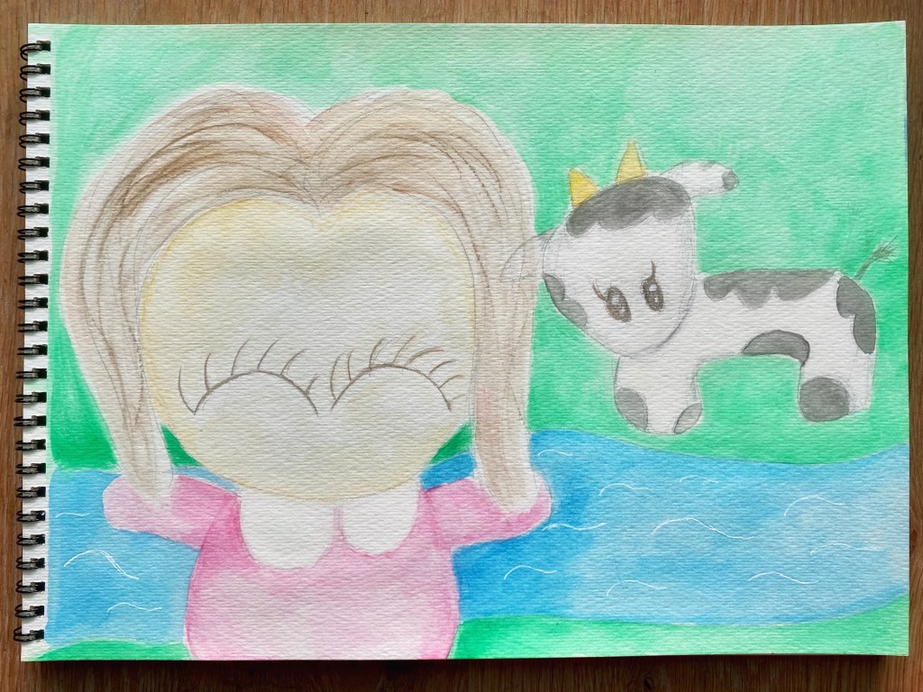 Still busy with preparing the new house and waiting for my old apartment to be sold. Meanwhile, I’m finding some time to squeeze in some creative time! Exciting days but I wish I could have more time. A week or so ago, I made a kawaii watercolour painting of our backyard which faces a farm over the bordering brook. And a few times a day march some cows across from the neighbouring barn to the fields! Little One is having so much fun watching them go by and wanted to have a photo taken. Instead, I made a painting of her posing with a cow wandering behind her!