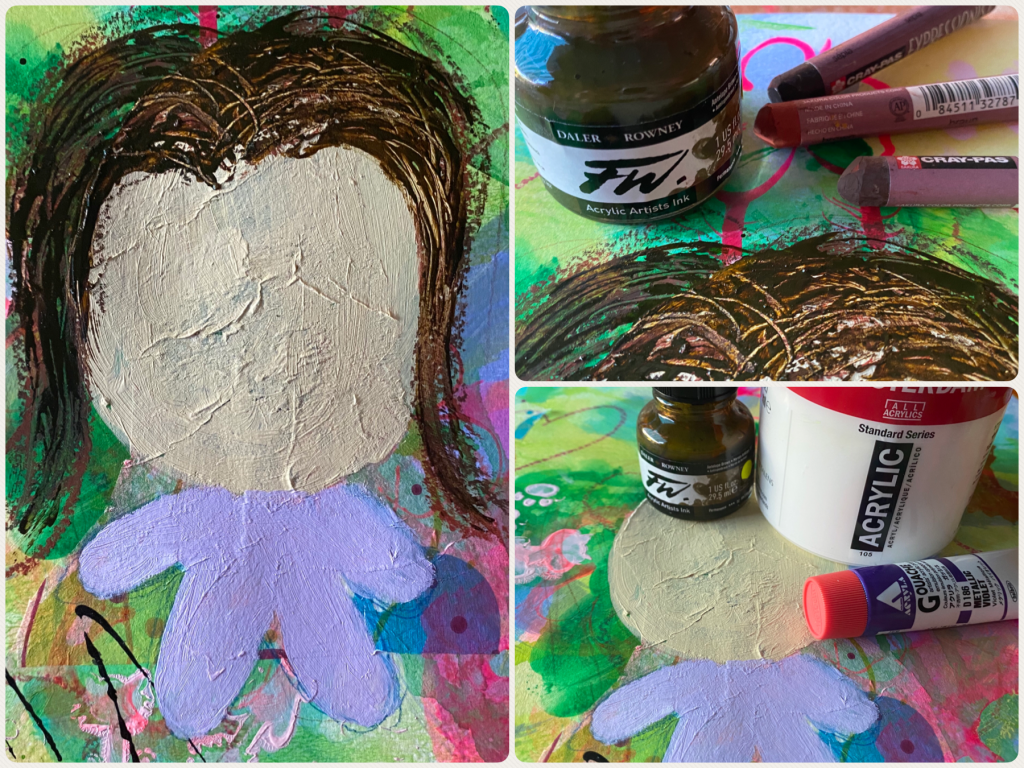 Little One is so cute! After sketching her on the painting with aquarelle pencil, I started with her face, mixing Antelope Brown ink with white paint. The hair was then drawn in with oil pastels of various brown shades before adding on some streaks of acrylic ink with a dropper and scratching with a satay stick. For the outfit, a lavender color was achieved mixing violet with white paint.