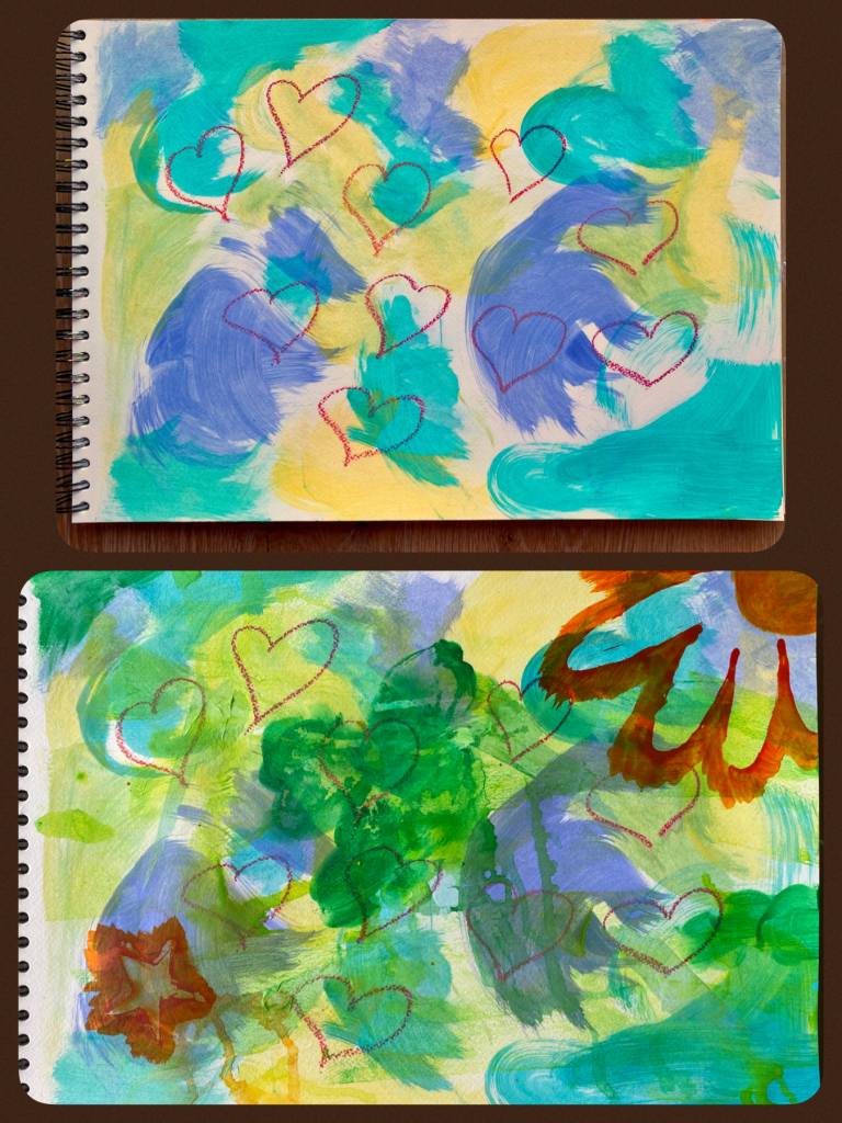 And of course I wanted to capture this cute moment! It’s not often I get to create some mixed media art using acrylic these days. I spend my days in our new home prepping it and when I’m free I do some sketching or watercolor painting, leaving the more “messy” stuff at the old house we are staying. Here I firstly doodled in some red hearts with oil pastels, followed by spreading some acrylic ink with a sponge brush. And once dry, I added another layer of paint in orange and green. I spritzed then on some water in some areas and watch the colors drip. So far so good!