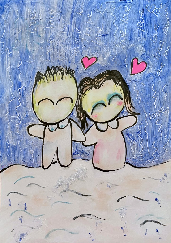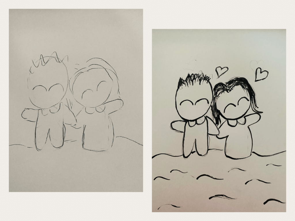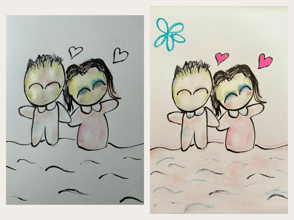 Now I see how the skin color works well with the blue background! I further love that pale washed-out look from the watercolor and pastels against the dark background, something I could adopt in my future paintings. And don’t we just look so cozy together? I love how Juliette’s characters feature tilted heads which gave me the idea to draw with such a different angle too. It makes us look so happy together that I even had to scribble love all over the background. Because we are hopeless romantics!