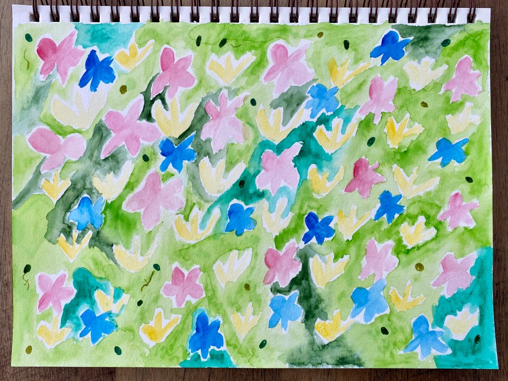 Well, for now I am done, but who knows, in a few months I may want to add more! Perhaps draw Little One in the painting or include some cute animals or just more flowers. That’s the thing about starting with doodles; you can just go on and on. For now, I’ll consider myself content with it and focus on learning to garden and keep it beautiful AND find more inspiration for my art work!