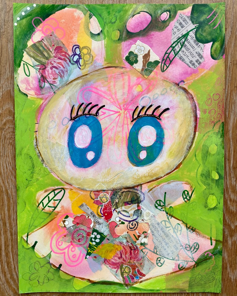 Now doesn’t our Teddy look all pretty and adorable? I love how colourful she is, and the background is a perfect green. It’s always a pleasure following Juliette’s classes as she makes her characters extra cute yet mysterious looking. As I also love combining kawaii anime with mixed media, this is a perfect opportunity. Look forward to more and developing my kawaii creativity further!