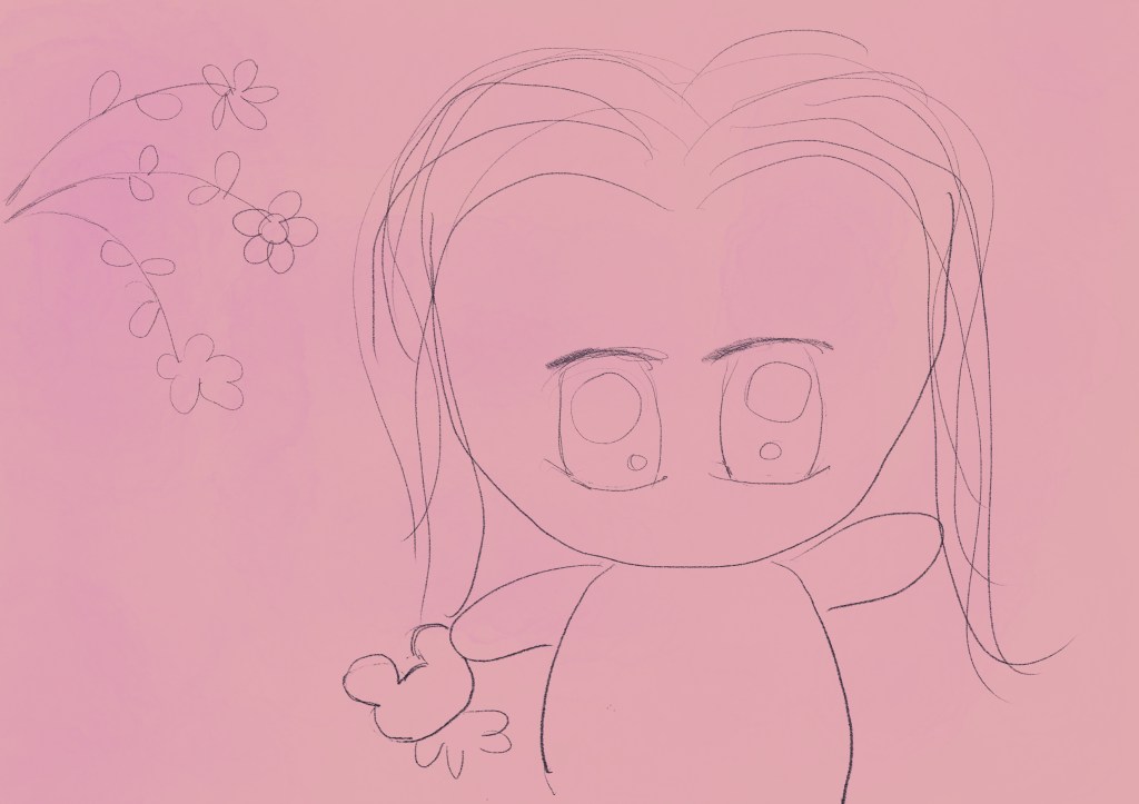 This time, I went for digital painting, using my iPad and Procreate app. A pink background was chosen on which I decided to make an outline first with black Derwent pencil. Normally I never make an outline first with digital art. I just plunge straight into the painting, but this time wanted to try something different. Whilst positioning Little One slightly to the right, I drew some flowers on the left sticking out from the edge. It’s always good to change composition in my work to give more variety. So far so good with Hello Kitty being added afterwards.