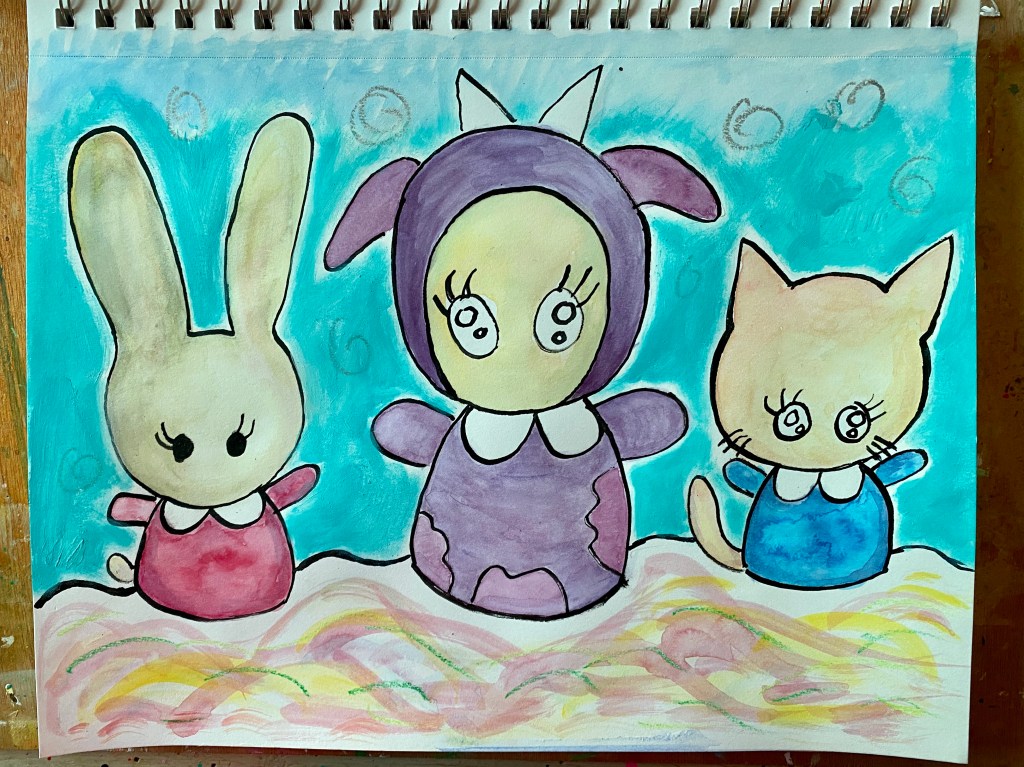 The experiment went well, I must say! For the faces I merely combined yellow, blue and magenta. I used a light touch for this by diluting the paints well with water as they are highly concentrated. Any excess magenta and blue I spread on the outfits of bunny and kitty. Some also got blended into the violet outfits for the cow. As for the background, I firstly scribbled some curves and spirals with oil pastels to give the watercolor some resistance before brushing the excess watercolor on, as you can see for the sky and ground.
