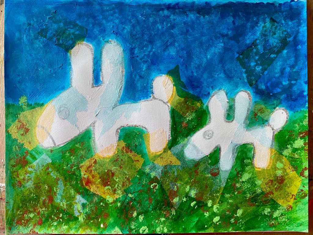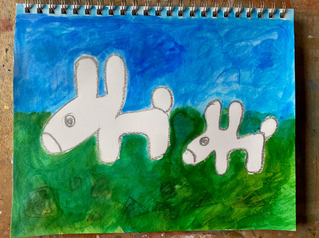 I did like the colours of the background but I felt more could be done, especially to cover the yellow collage paper a bit. For the sky, I layered up with some Marine Blue but seeing how dark it turned out, I covered it with a mixture of Cobalt Blue and tapped on some Light Blue Heavy Acrylic by Golden and some Iridescent Blue acrylic paint by Old Holland. As for the grass, I also went for some Heavy Acrylic and Iridescent paint, in Light Green by Golden and Iridescent Bronze by Old Holland, respectively. The doggies were then painted in Titanium White but thinned down with some acrylic medium to ensure translucency. Finally, I went over the outlines with some grey coloured pencil to reinforce them. And here we are now!