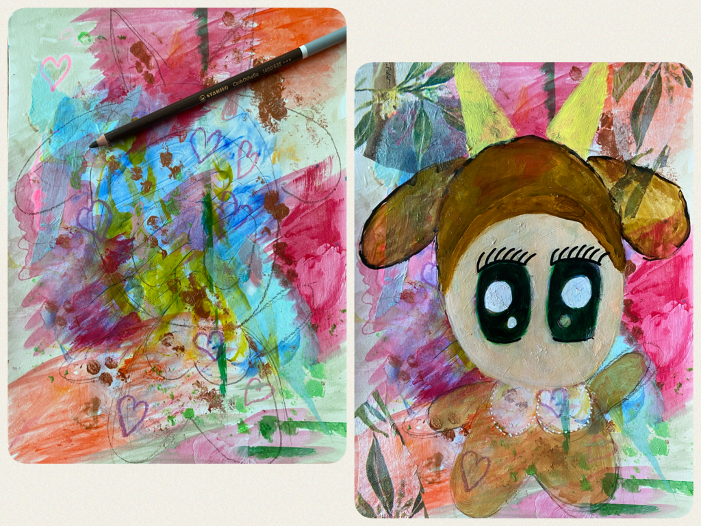 Little One is now Little Cow Girl! It was so much fun painting this piece. Looks like a sweet whimsical animal painting typically seen in the works of mixed media artists. By following classes of other artists, I’ve certainly gained inspiration and ideas whilst developing my own style. Creativity is an ongoing development. Looking forward to creating more kawaii work!