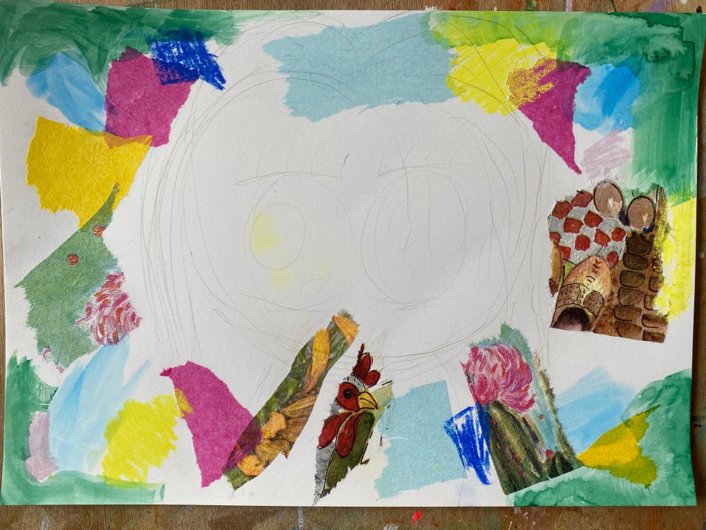 And Little One has green eyes today! In between Tracy Verdugo’s Story Painting classes I thought I’d take a little break and do something else. I resumed Juliette Crane’s Happy Painting Mini Course and now on Project 4. On some A4 size Bristol paper, various collage papers were glued around and colours drawn in with soft pastels. The center was left out where I could sketch the cute face of Little One!