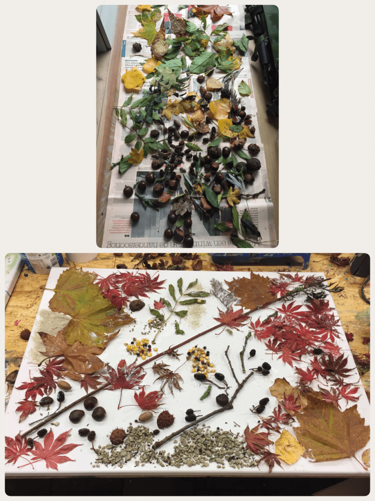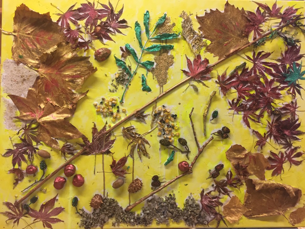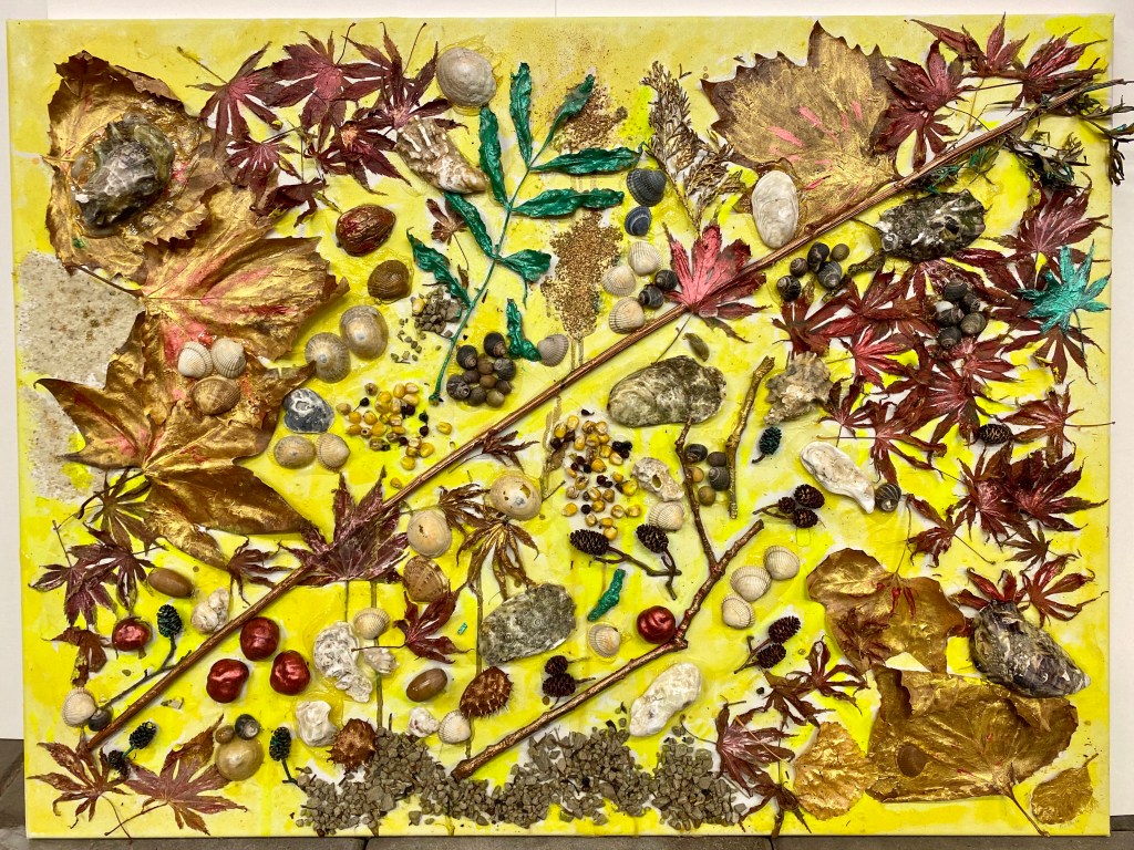 Actually this painting began around the same time last year. We were assigned to take a walk in the countryside during the week and come to class with leaves, twigs, nuts, pine cones and even sand and gravel, and whatever we could find. Then at class, we made a collage of them on canvas! Acrylic medium and wood glue were used to stick them on. So here I was randomly getting creative…