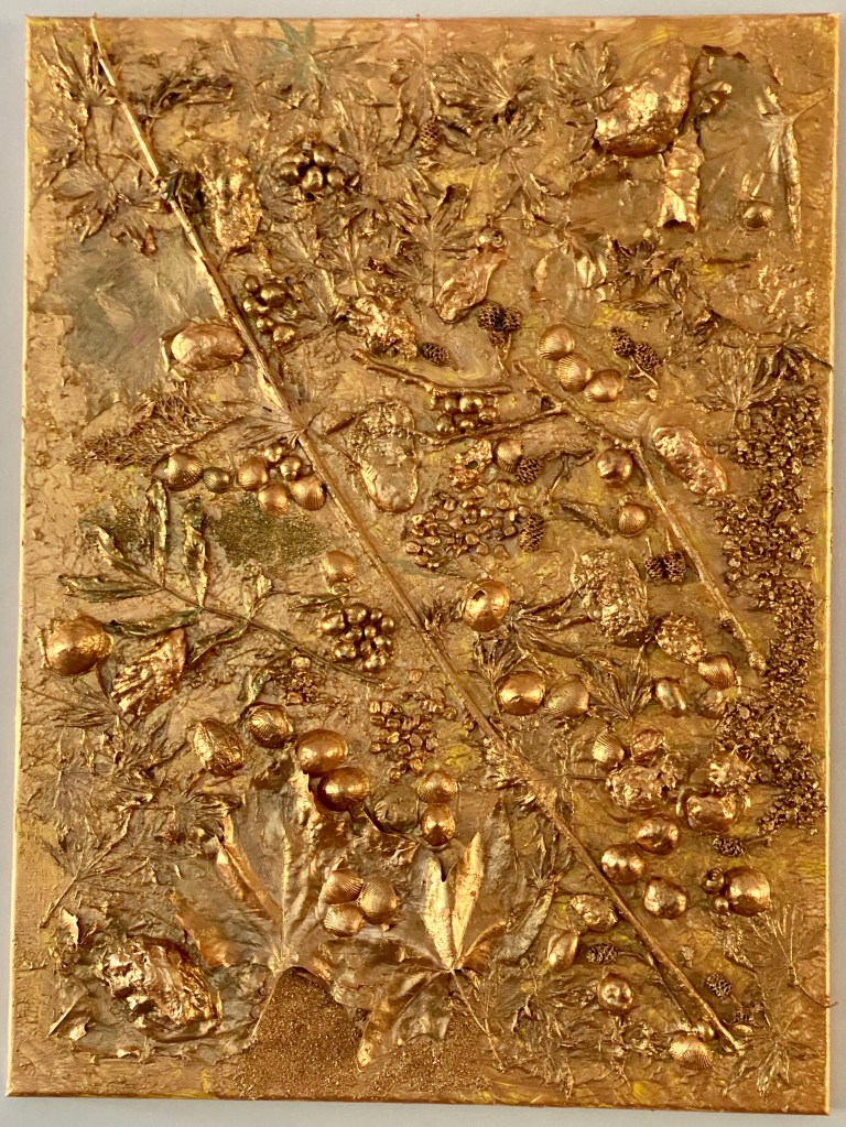 I still was not satisfied. It was the yellow background that was killing it. So what to do? Once again another sound advice from my tutor: cover it all up! Well actually add a coat of paint over it so that the metallic colors still show through but hides the yellow. First thing that came to mind was gold! It took a large tube of gold acrylic paint (and a bit of bronze) with lots of acrylic medium to achieve this. To make it more “wow” some gold powder pigment was mixed in. I was careful not to break the leaves as I applied the gold paint with tapping motions, but I was amazed how they stayed intact. Finally after some time of perfectly makimg sure I didn’t miss any spot, I was done!
