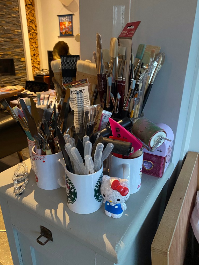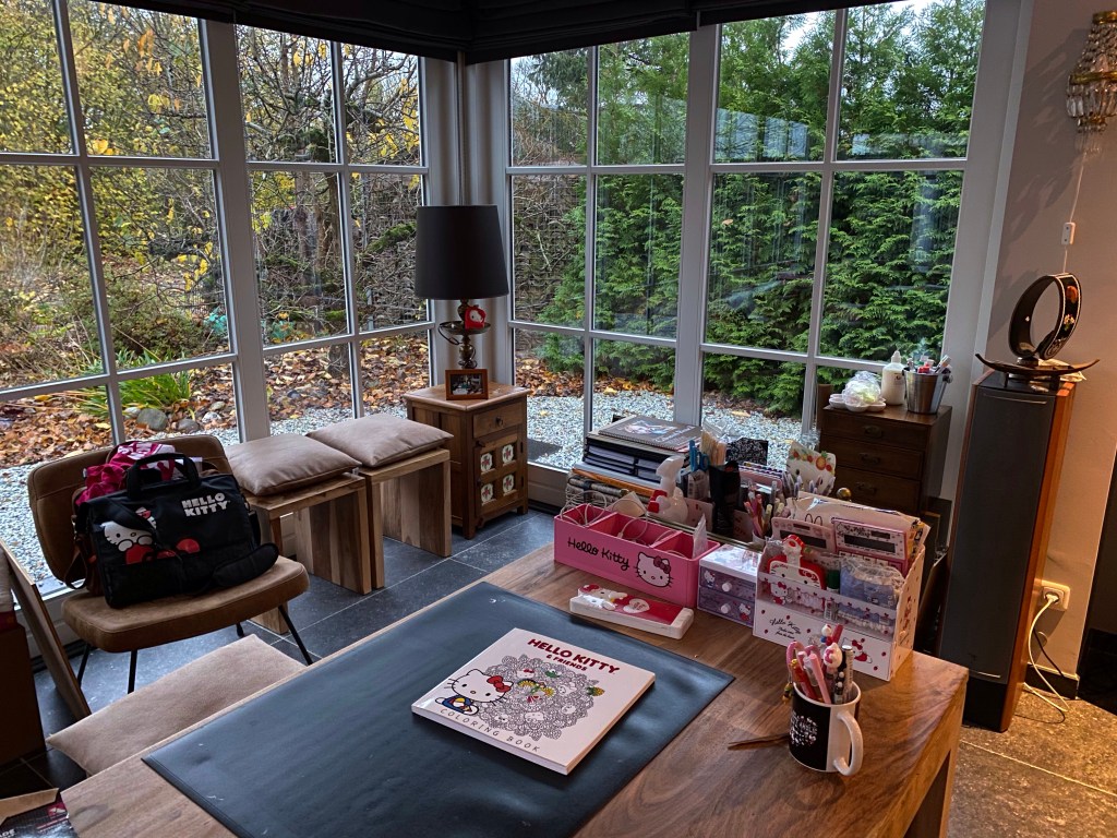 It’s far from being 100% completed though. I still have loose boxes and random furnitures to temporarily store my art supplies but at least they’re organized so I can find things when needed. And at least I got my old dining room table and seats from Amsterdam to use in my studio. Now I can comfortably sit and get painting again! As you can see I’m a huge Hello Kitty fan. An avid collector in fact! So bits and pieces of her stuff are cozily scattered around the studio to keep me company.