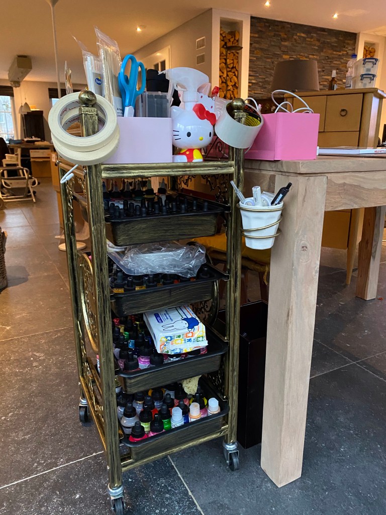 One of the additions I’ve got now is a trolley next to my desk to give more surface space whilst I’m painting. Nowadays I’m also working with larger paper and would like to start using canvas and planks of wood as substrate. This beautiful trolley is actually purposely built for hairdressers and is thus quite sturdy. Even comes with a hairdryer holder! That may come in handy when I need to speed up drying my wet paint…