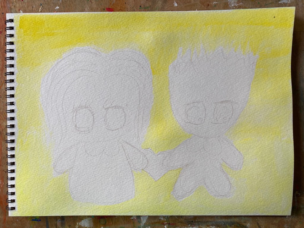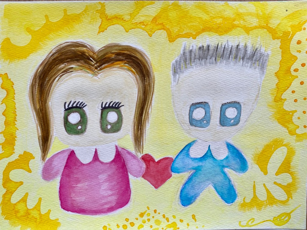 First I worked background in yellow using two shades of this colour from Dr Ph Martins Hydrus liquid watercolor. Then I painted us this time with my Gansai Tanbi watercolors. The outfits though were colored using Jane Davenport’s pans of watercolors which I had found hidden in my drawers of art supplies. It’s been some time since using them and thus thought it would be a nice change. I do like the vibrant colours, especially the pink!