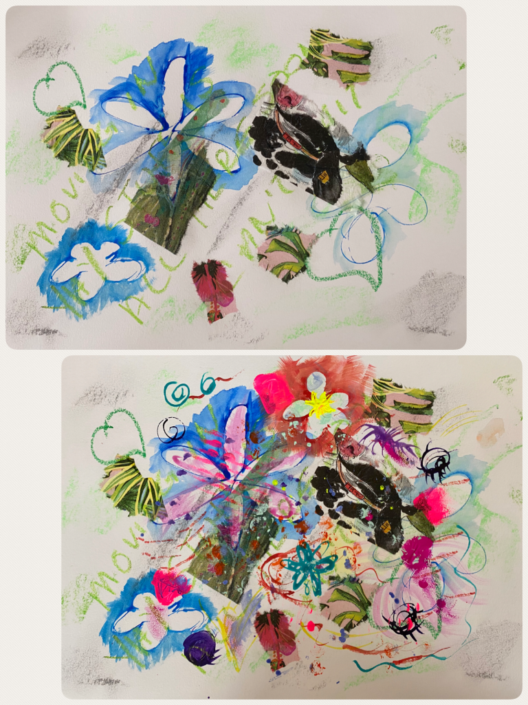 So the intuitive mixed media session begins! First some paper napkin collages and flowers with my acrylic ink. Then some mark-making by stamping on some bubble wrap and corrugated cardboard from the packing materials! They were the only available items as my stamps were still packed away somewhere. I also doodled more with acrylic as well as India inks.