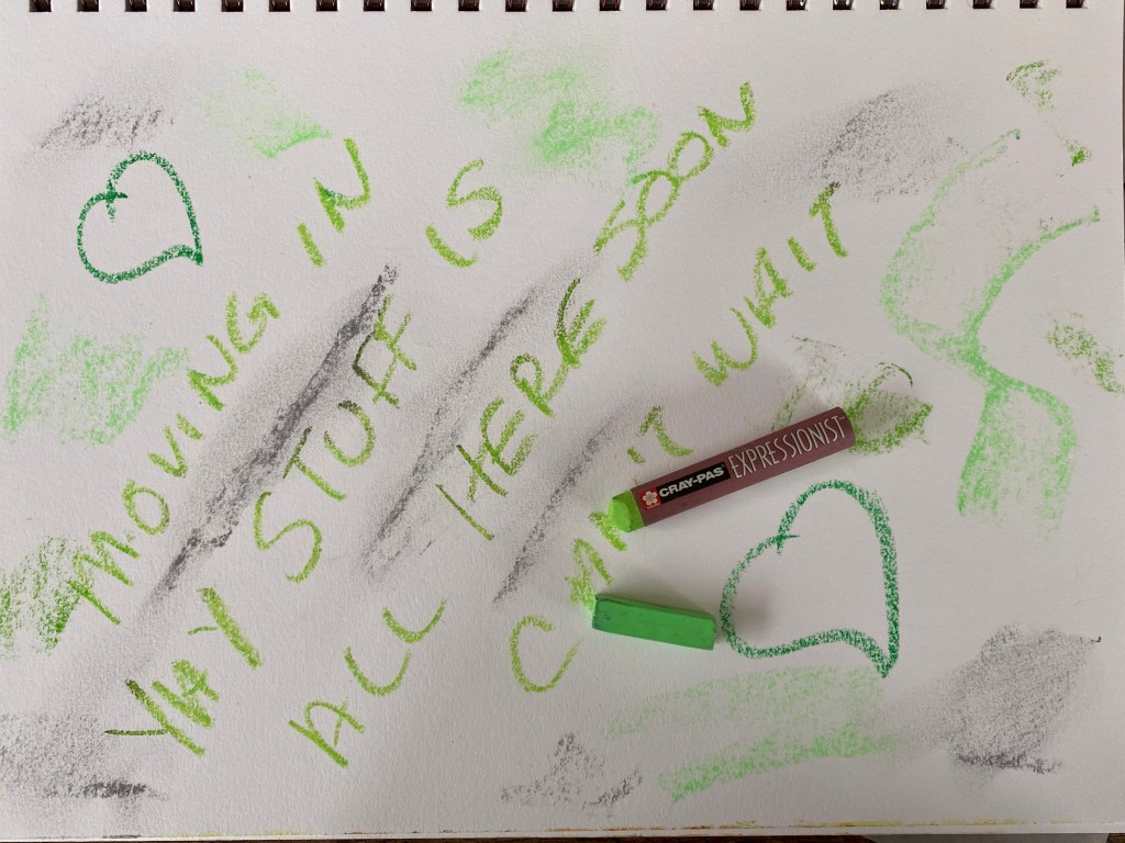 Well instead of complaining, I try and stay positive. Just the other day my stuff from Amsterdam finally arrived to our new house! They’ve been packed in boxes since July as I emptied out my old apartment to prepare selling it and moving homes. I thought I’d express my excitement about it with my oil pastels and scribble around with my soft pastels on my sketchbook (Strathmore Visual Journal for Mixed Media):