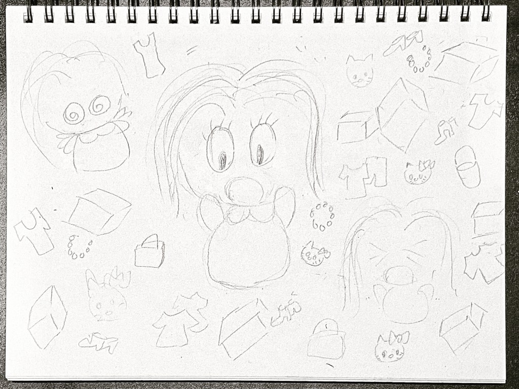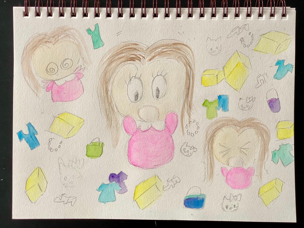 And I’ve had very little time to paint and could not get myself to get started. I’m not able to focus. This has been happening lately as well, and I really need to get into the habit again: at least 2 hours daily of creative activities! And hence a few weeks ago, I sat down and began drawing. The many faces of Little One getting all worked up and surrounded by all her stuff: shoes, clothes, handbags and loads of Hello Kitty’s!