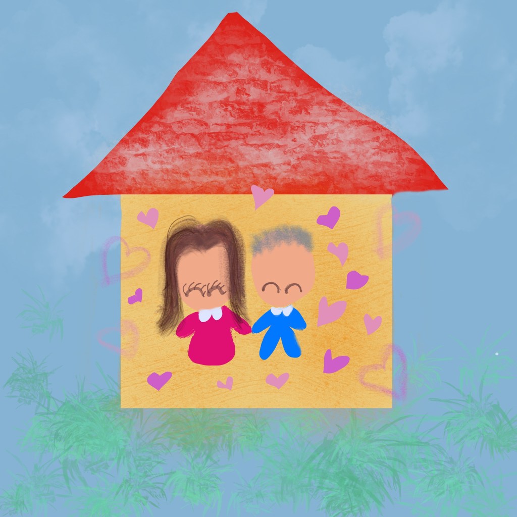 The next layer involved adding some concrete block and stone wall textures onto the house. Then I drew us holding hands, once again using the colorfill feature. Our hair was scribbled in with the retouch features with hearts doodled in around the house.