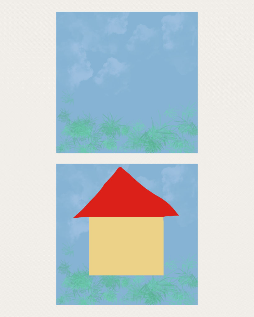 I thought some digital painting would be fun to do as I could do with some practice. How about introducing some positive vibes this time illustrating boyfriend and me getting all cute and cozy together? Against a blue background I painted on some clouds and Hessian grass (preset) before drawing in the house using the colorfill feature.