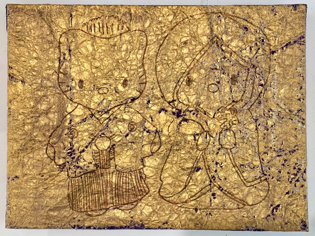 After spreading out the paper on the wooden frame, I added a layer of yellow watercolor pigment followed by some gold. Whilst waiting for the paint to dry, I traced the image on tracing paper and when dried I went over the outline with some red carbon paper on the newly-gold background.