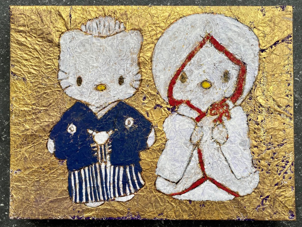 Today I’d like to share a special painting I made to commemorate me and my BF moving in together! It’s another Hello Kitty art work where she is dressed in a traditional Japanese wedding outfit with her BF Dear Daniel. Although we ourselves aren’t married and merely registered partners for now, I went for this wedding theme as it wasn’t easy to find something romantic featuring Hello Kitty and with a traditional Japanese twist.